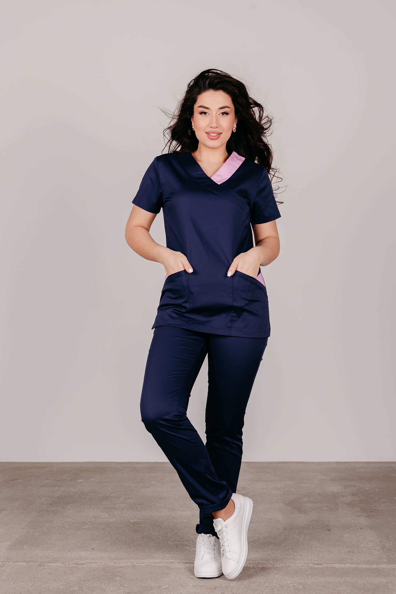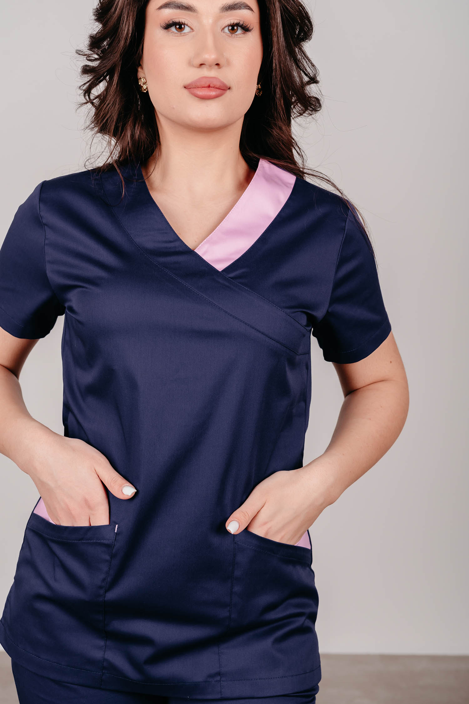 Современный классический топ прилегающего силуэтас V-образным вырезом. Глубокие вместительные карманы. Разрезы по бокам обеспечивают комфорт и свободу движений.