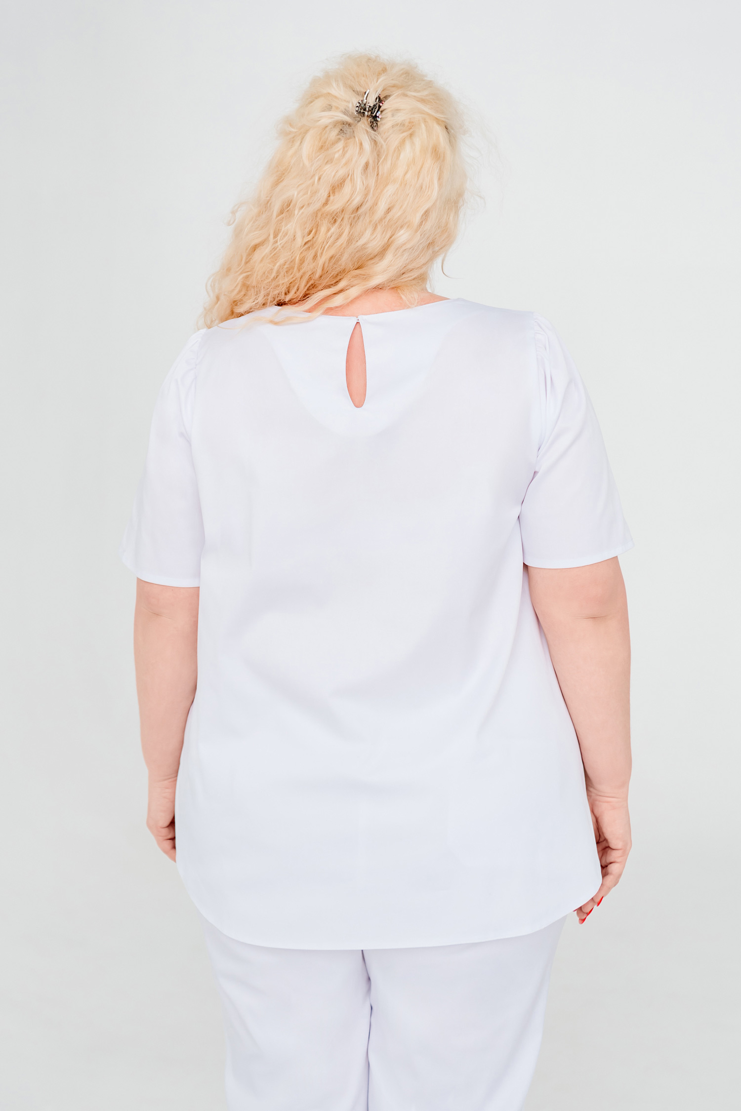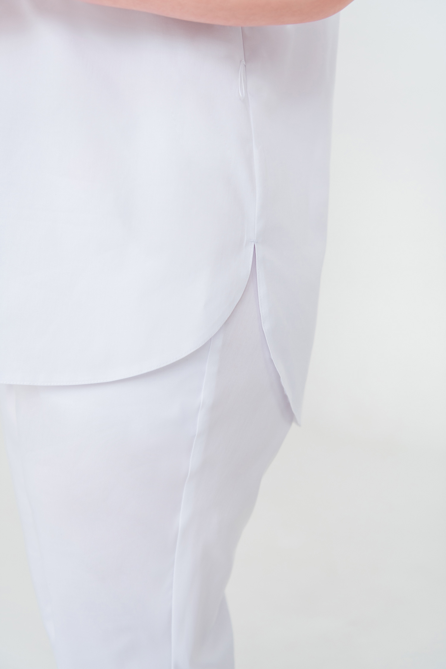 Медицинская свободная блуза А-силуэта с асиметричным низом, съемным поясом-бантом и рукавом-фонариком. Сзади красивая застежка-капелька. Высокие разрезы в боковых швах не мешают доступу в карманы брюкЛиния горловины и нагрудный кармашек украшены белым кантом. Шлевки в боковом шве позволяют регулировать положение пояса: опускать пояс ниже или выше или вовсе носить без пояса.