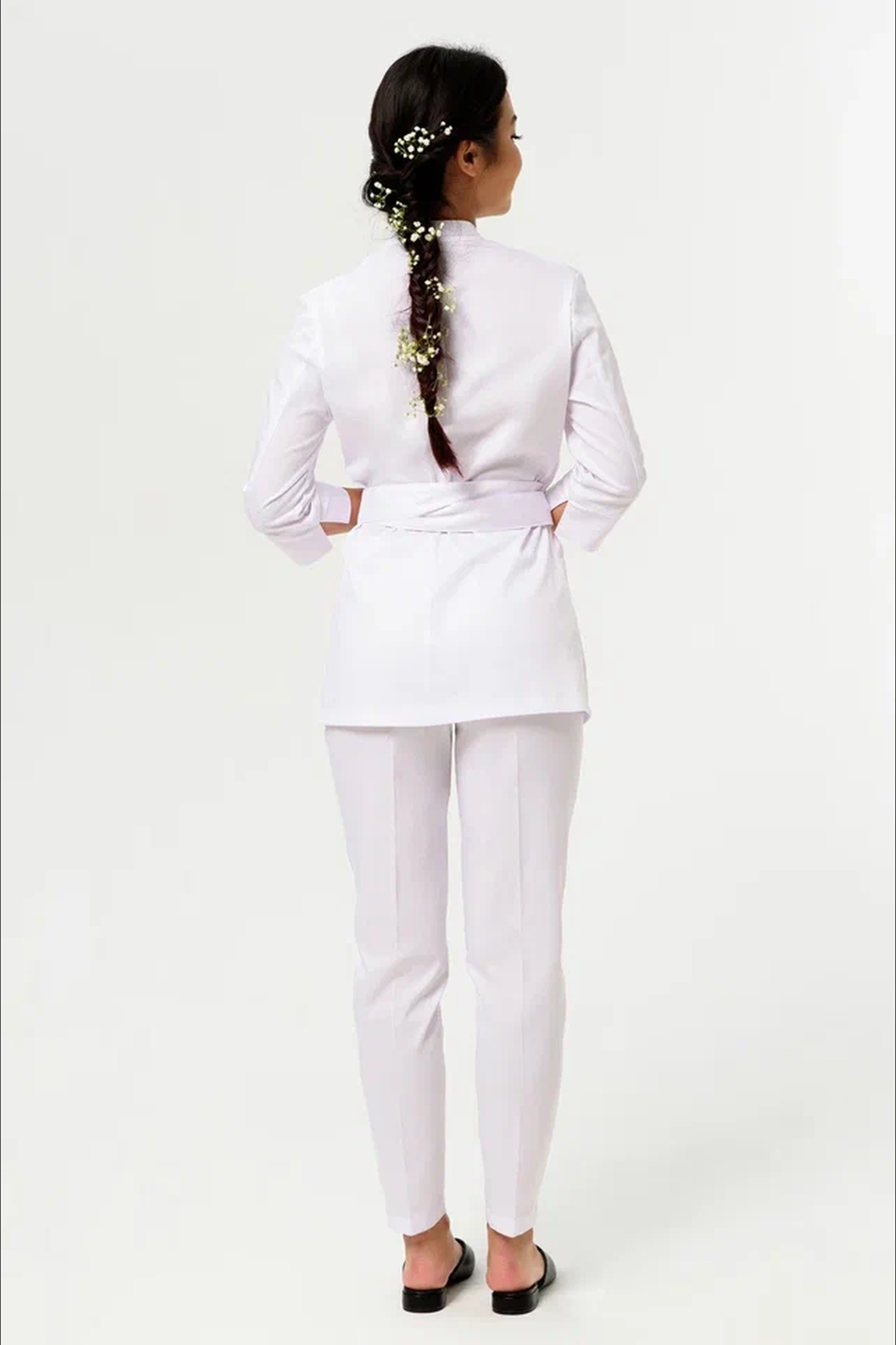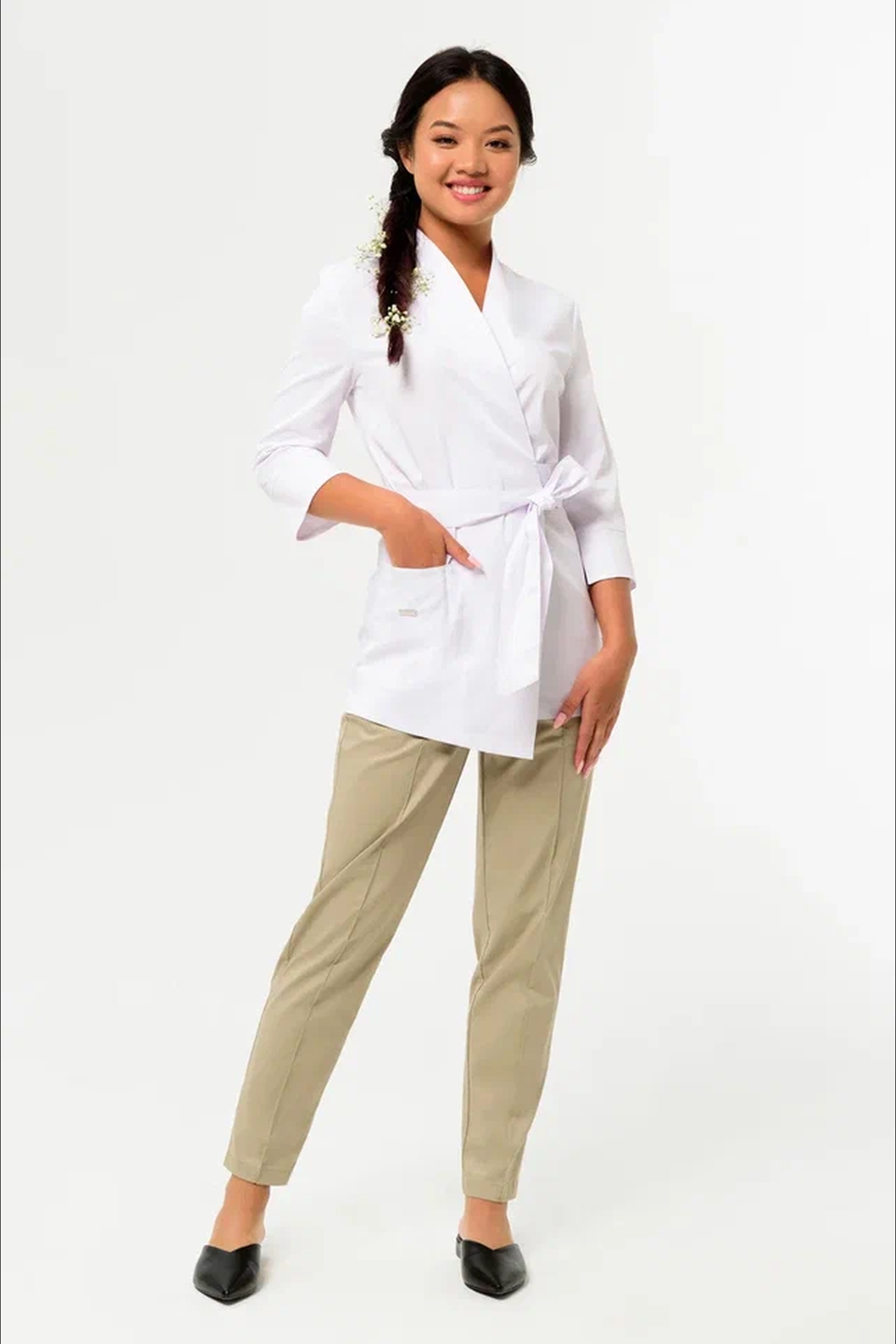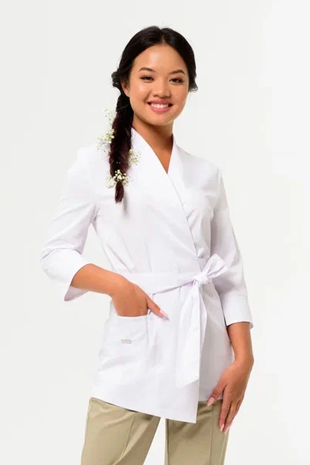 Медицинский жакет-кимоно из коллекции «Красота востока»Изящный силуэт, асимметрия и правильные акценты на фигуре: прилегающий верх, пояс и трапециевидный низ блузы. На правой полочке глубокий и удобный накладной карман. Красивый рукав ¾ с разрезом по внутреннему шву Имеется внутренняя тесьма, которая надежно фиксирует запах.
