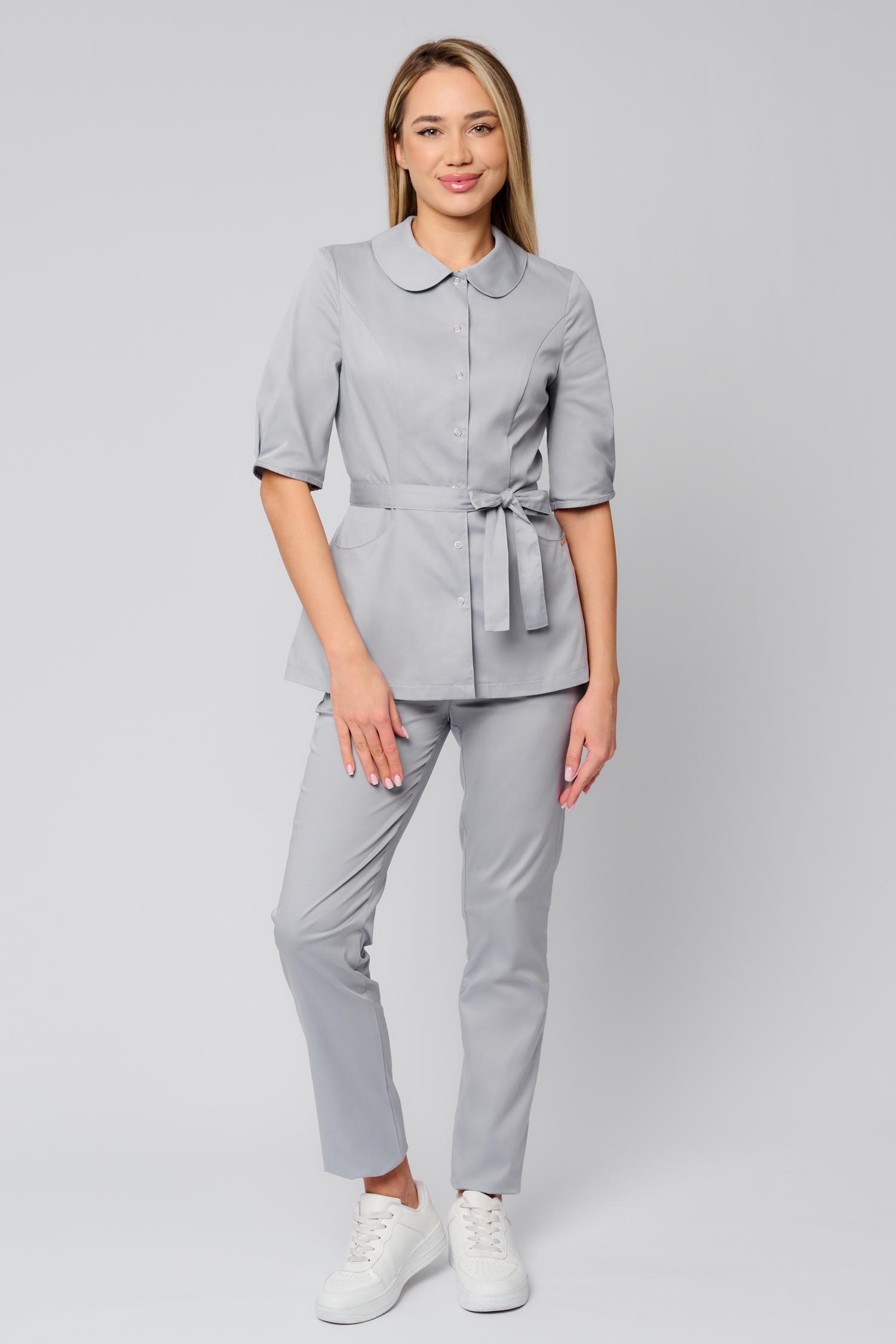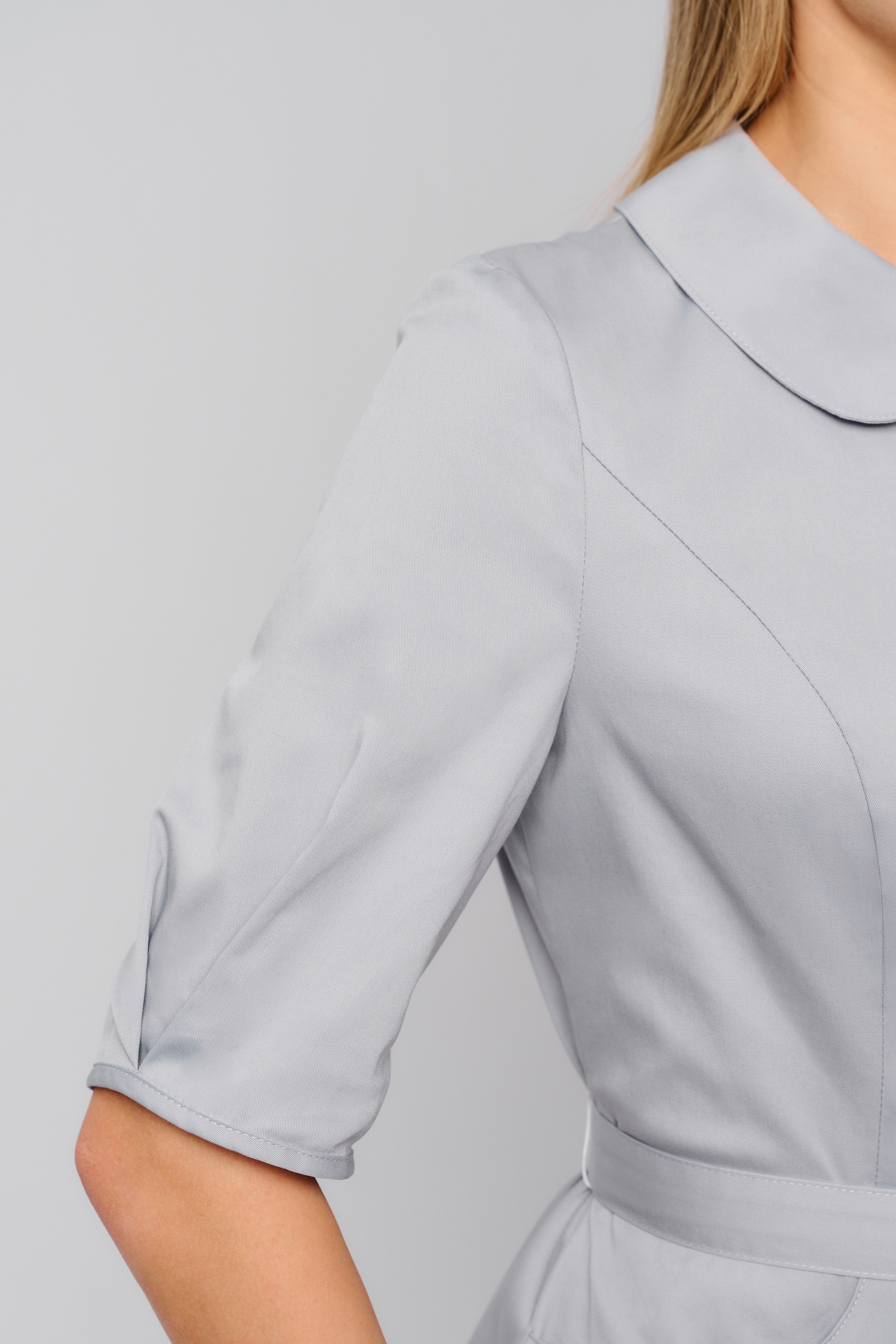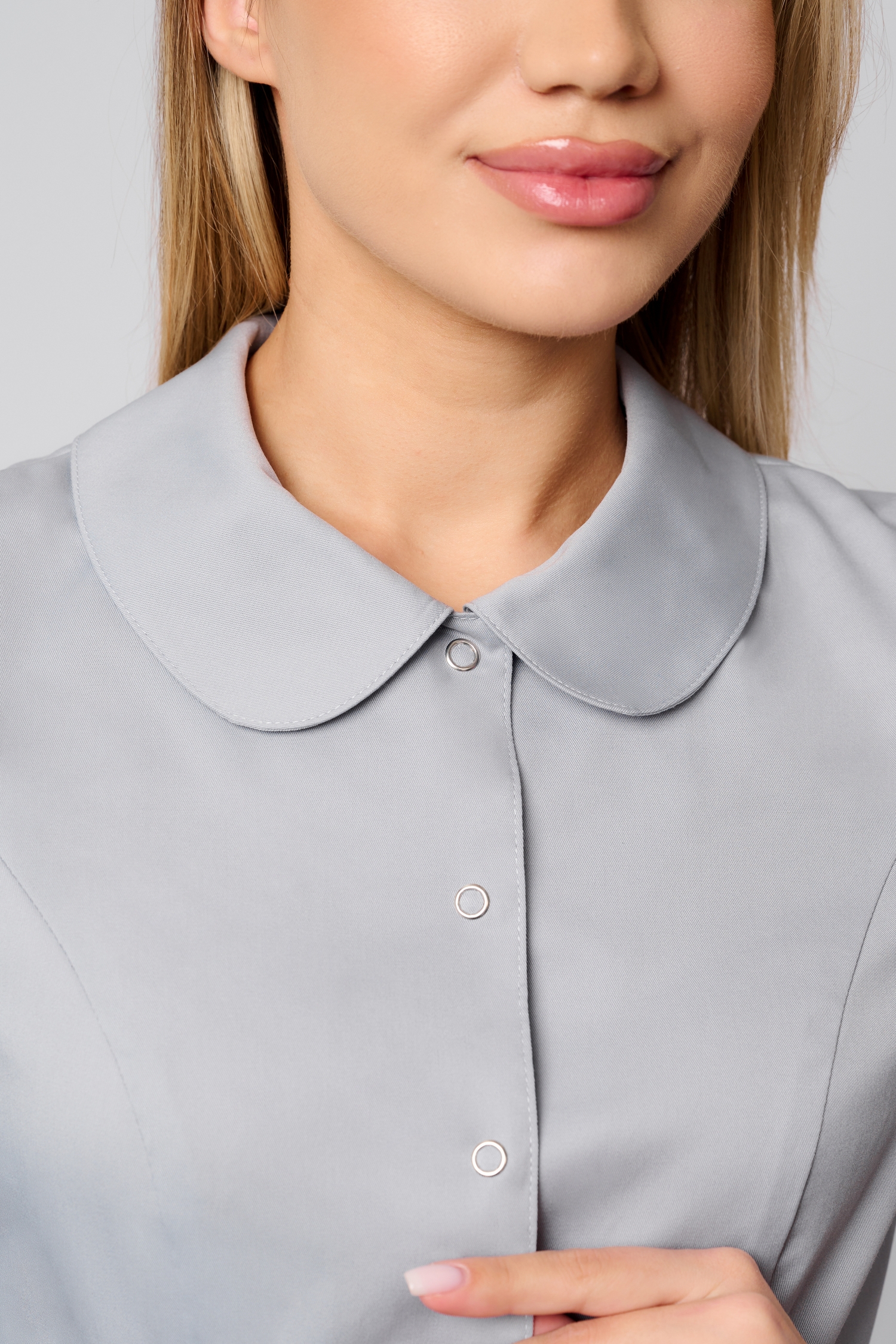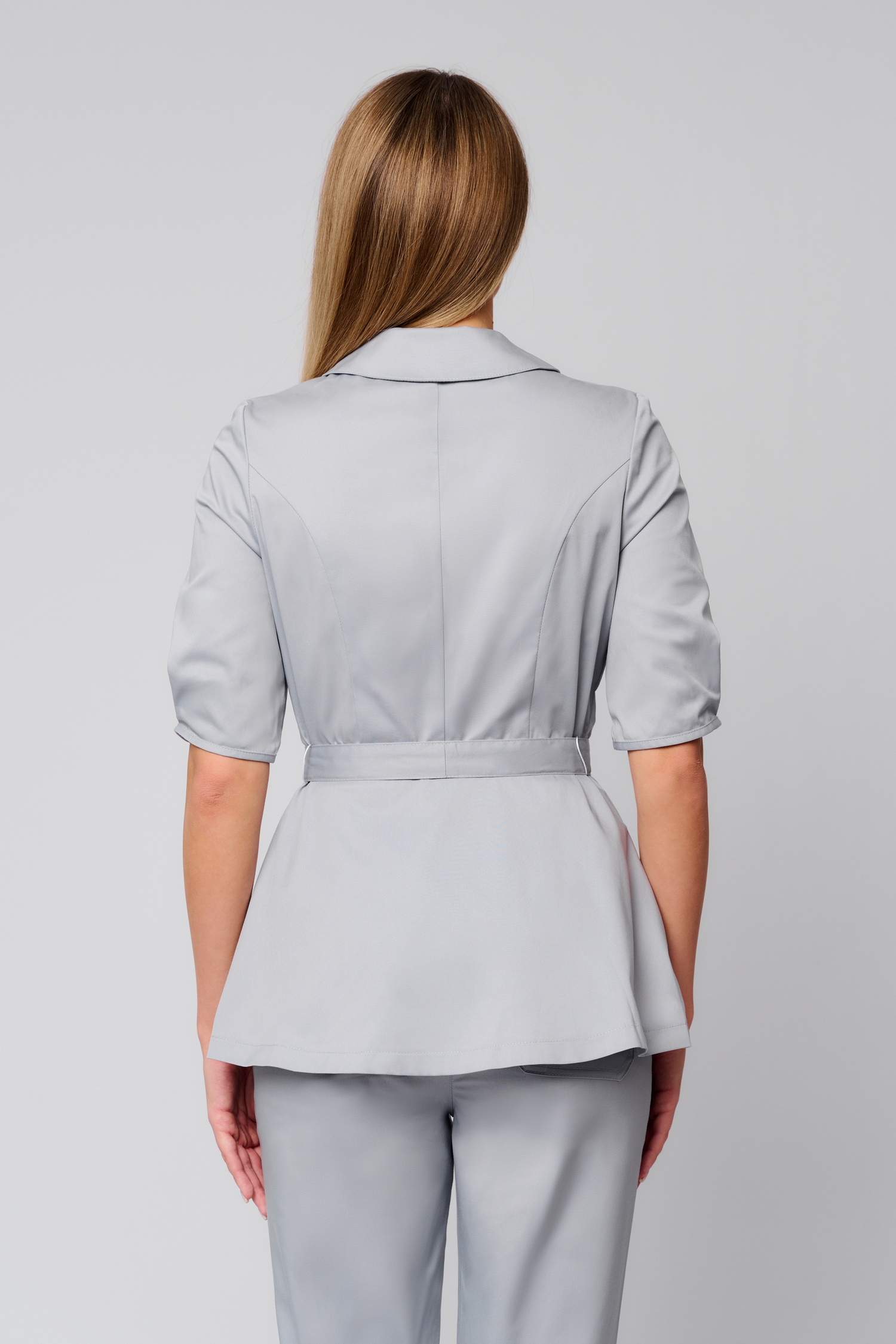 Интерпретация стиля New Look с акцентом на талии и широкой баской Элегантная блуза полуприлегающего силуэта, отрезная по талии, рукав до локтевого сгиба. Удобные глубокие карманы расположены чуть ниже уровня талии. Шлевки в боковом шве позволяют регулировать положение пояса: опускать пояс ниже или выше.