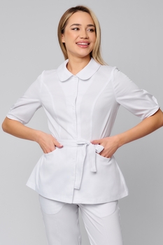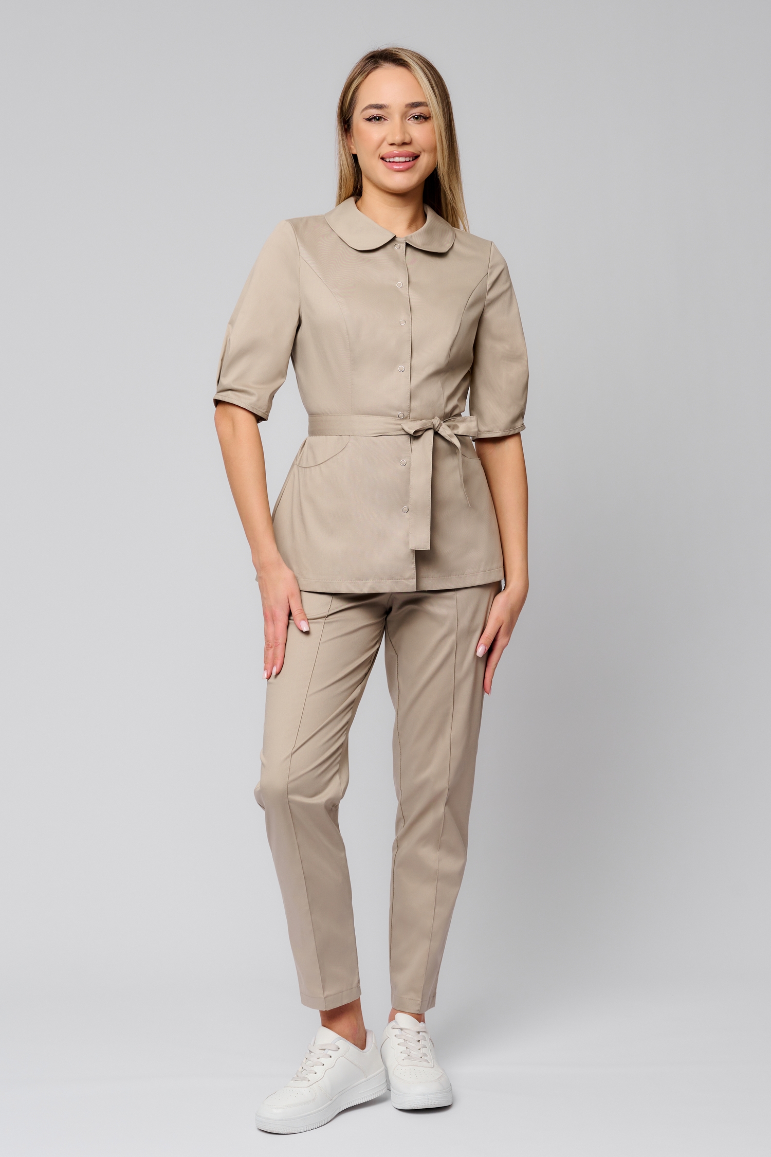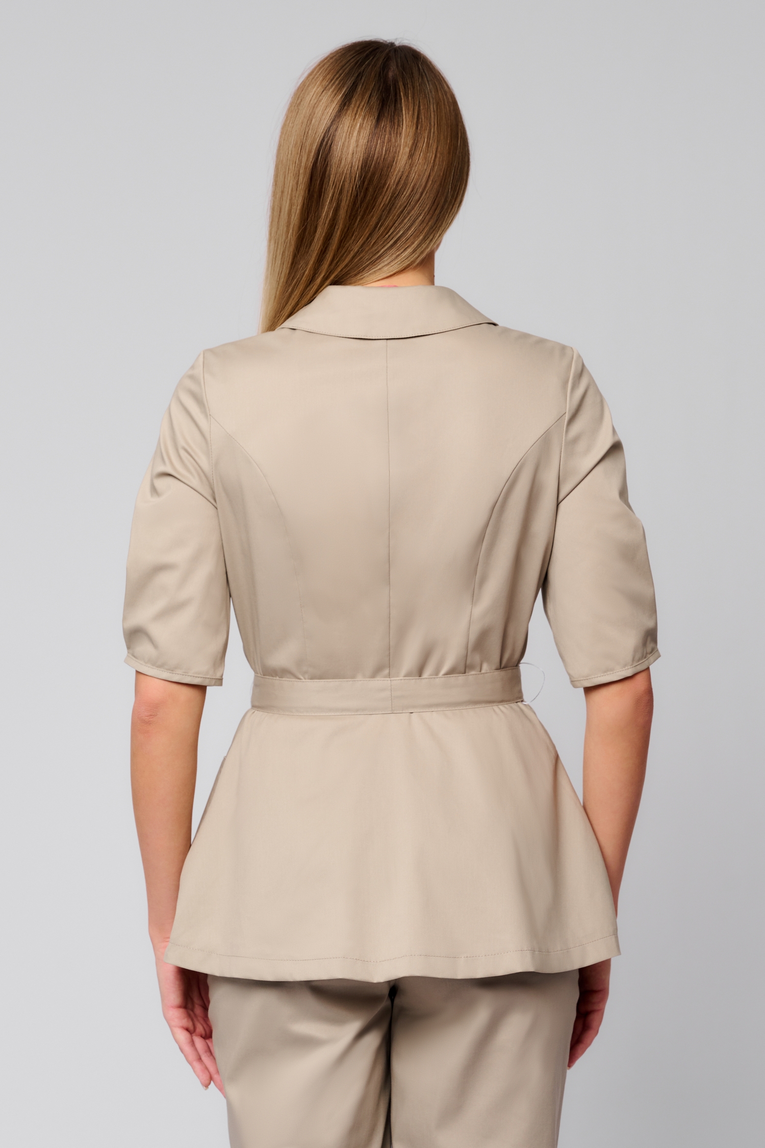 Интерпретация стиля New Look с акцентом на талии и широкой баской Элегантная блуза полуприлегающего силуэта, отрезная по талии, рукав до локтевого сгиба. Удобные глубокие карманы расположены чуть ниже уровня талии. Шлевки в боковом шве позволяют регулировать положение пояса: опускать пояс ниже или выше.