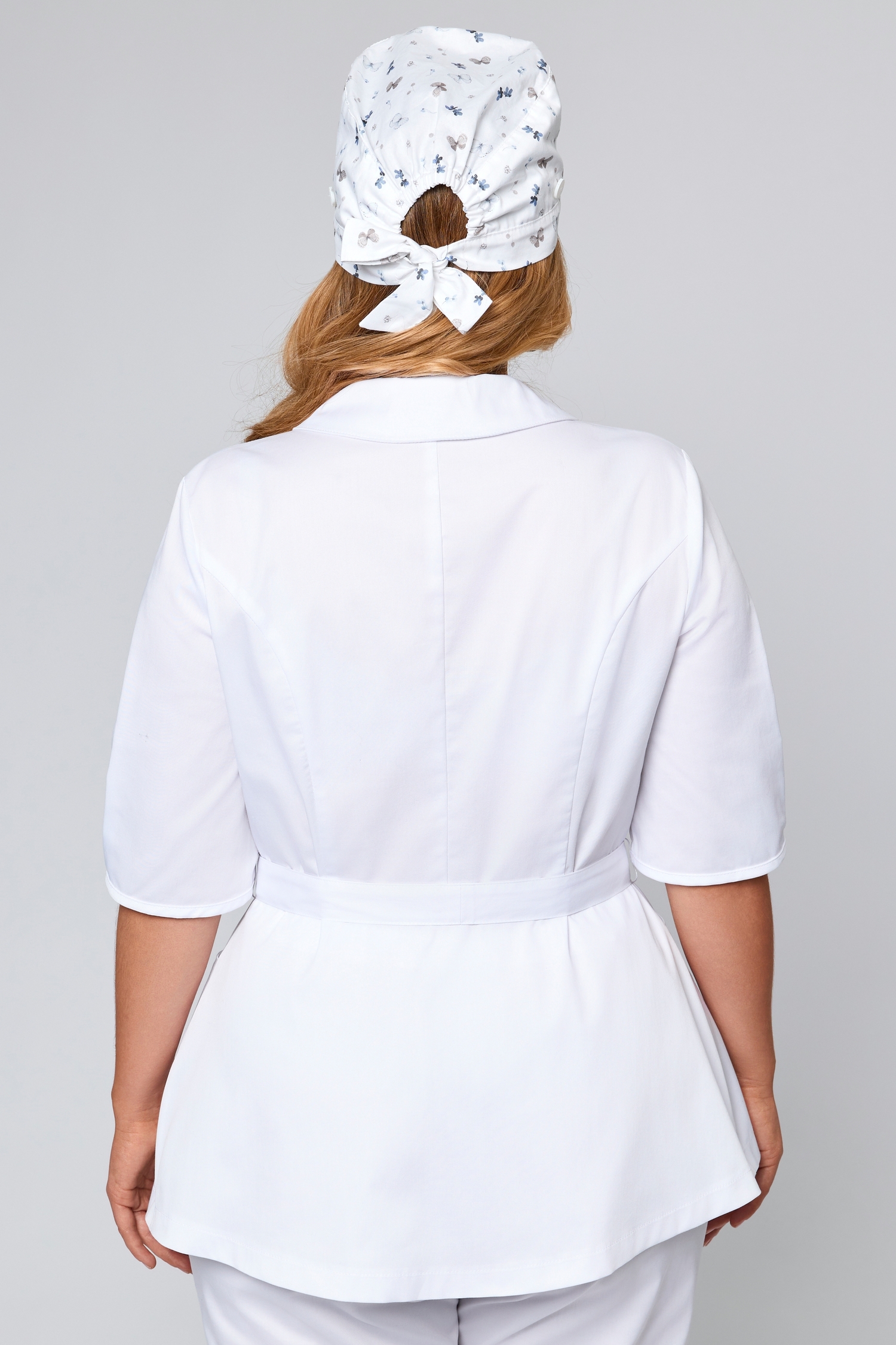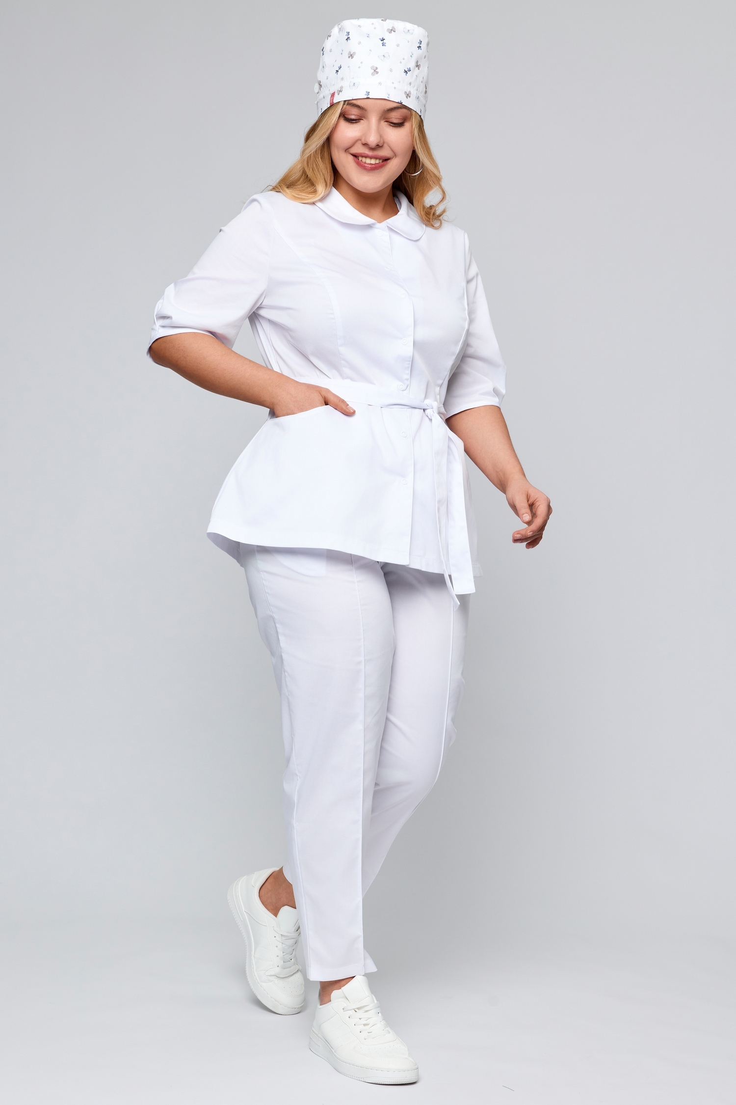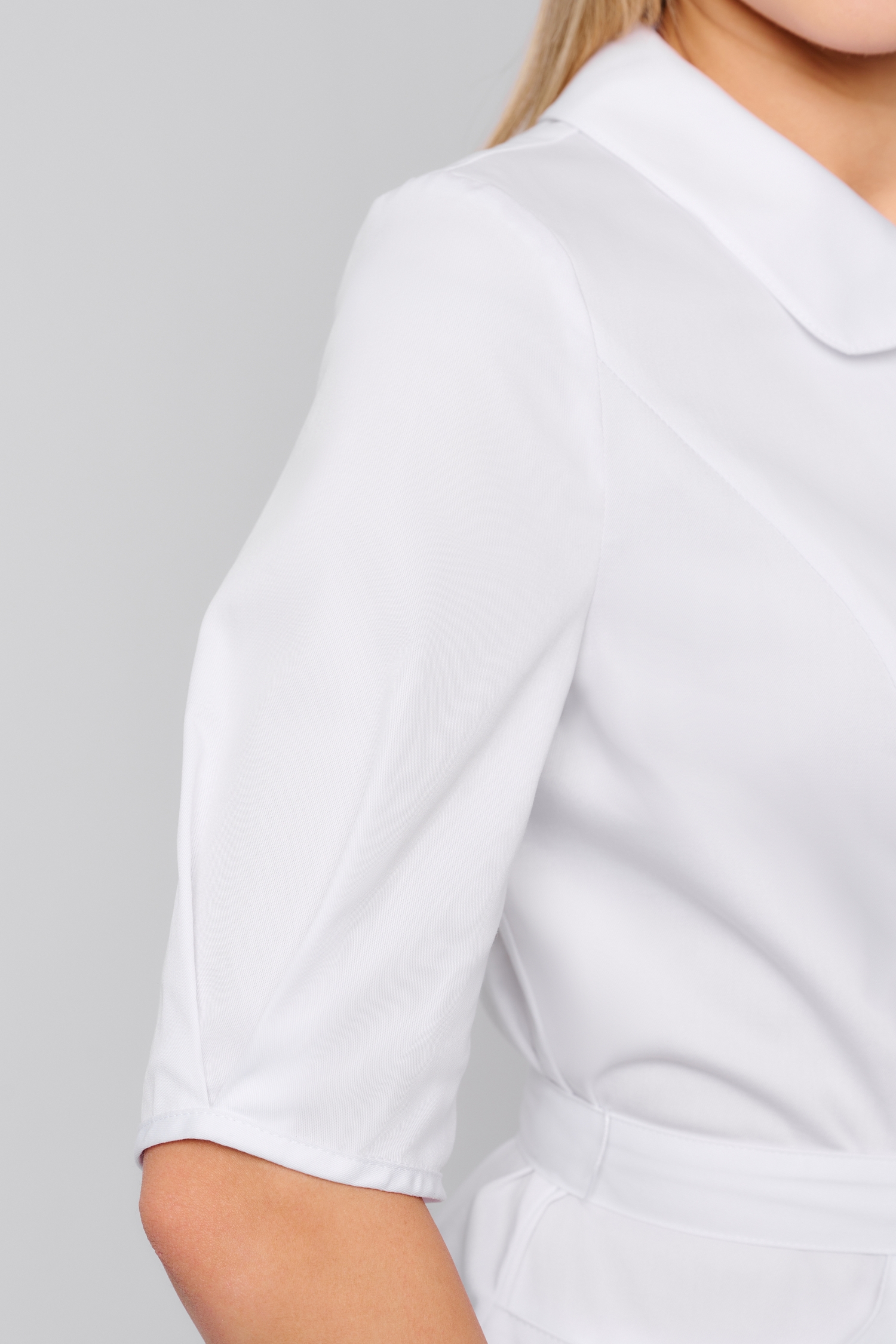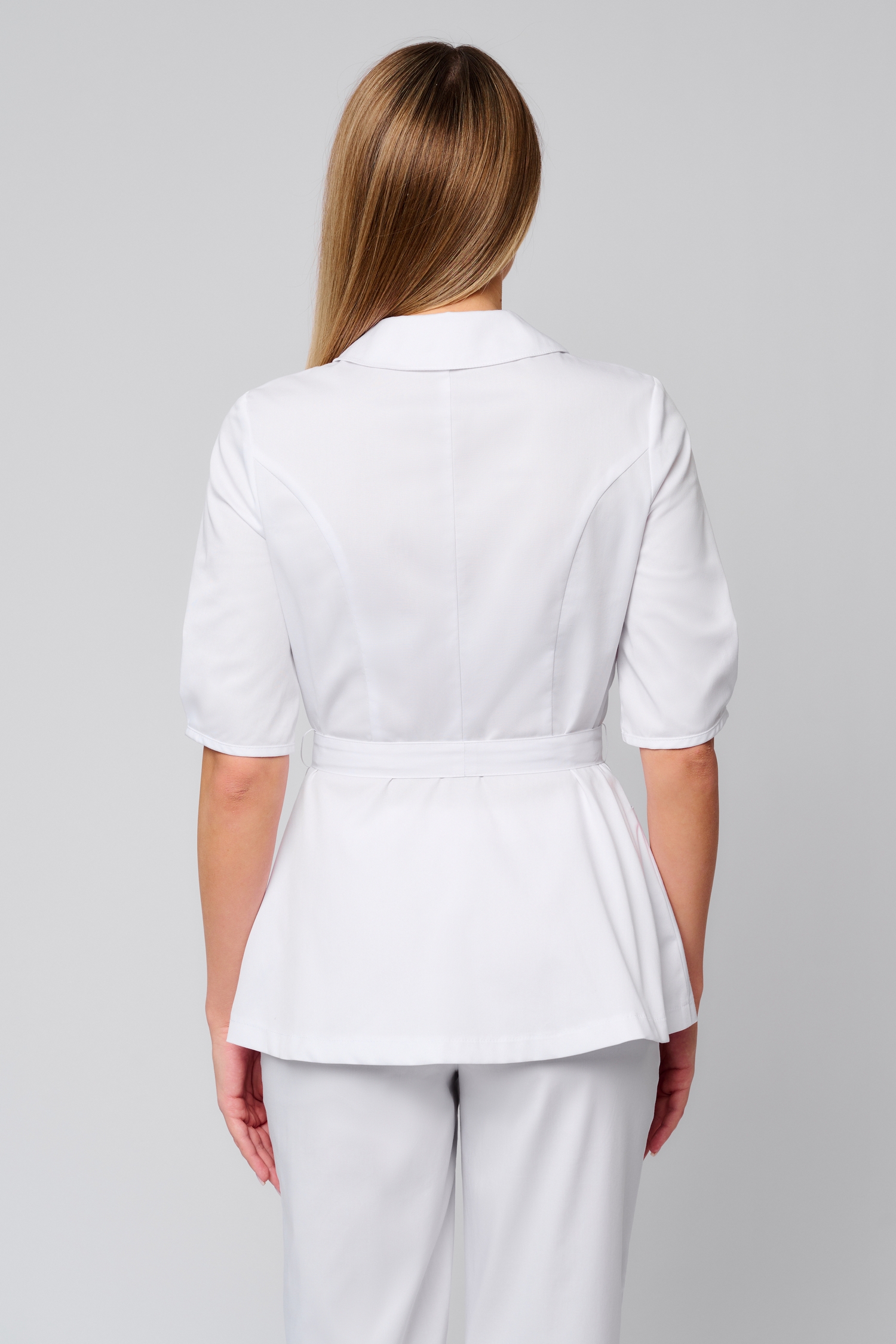 Интерпретация стиля New Look с акцентом на талии и широкой баской Элегантная блуза полуприлегающего силуэта, отрезная по талии, рукав до локтевого сгиба. Удобные глубокие карманы расположены чуть ниже уровня талии. Шлевки в боковом шве позволяют регулировать положение пояса: опускать пояс ниже или выше.