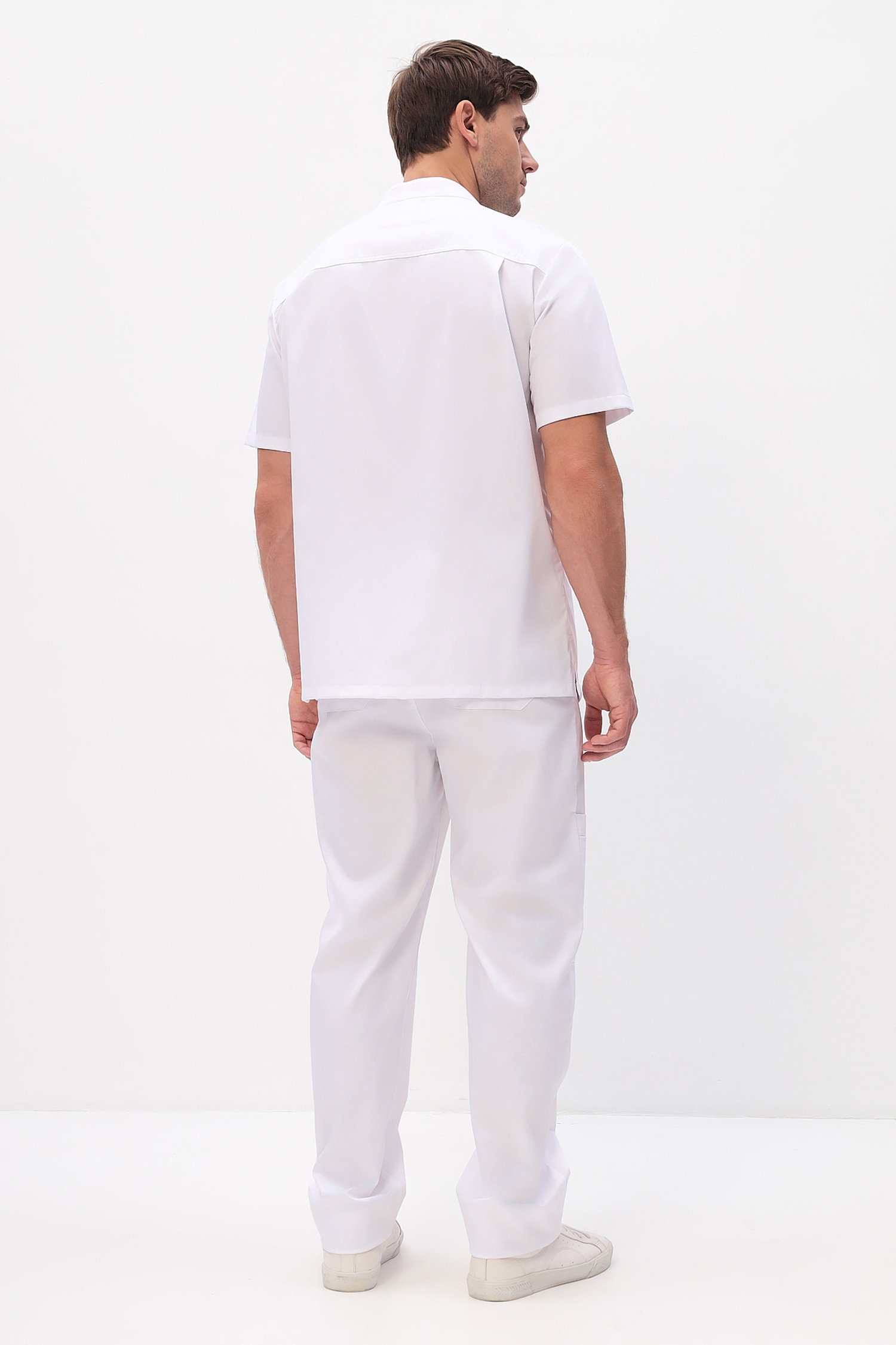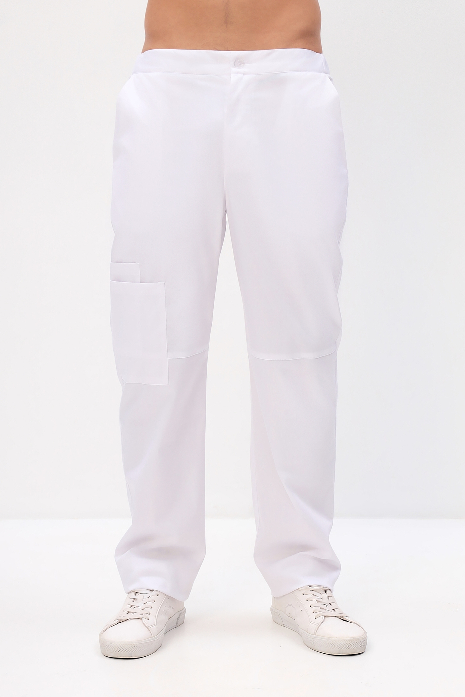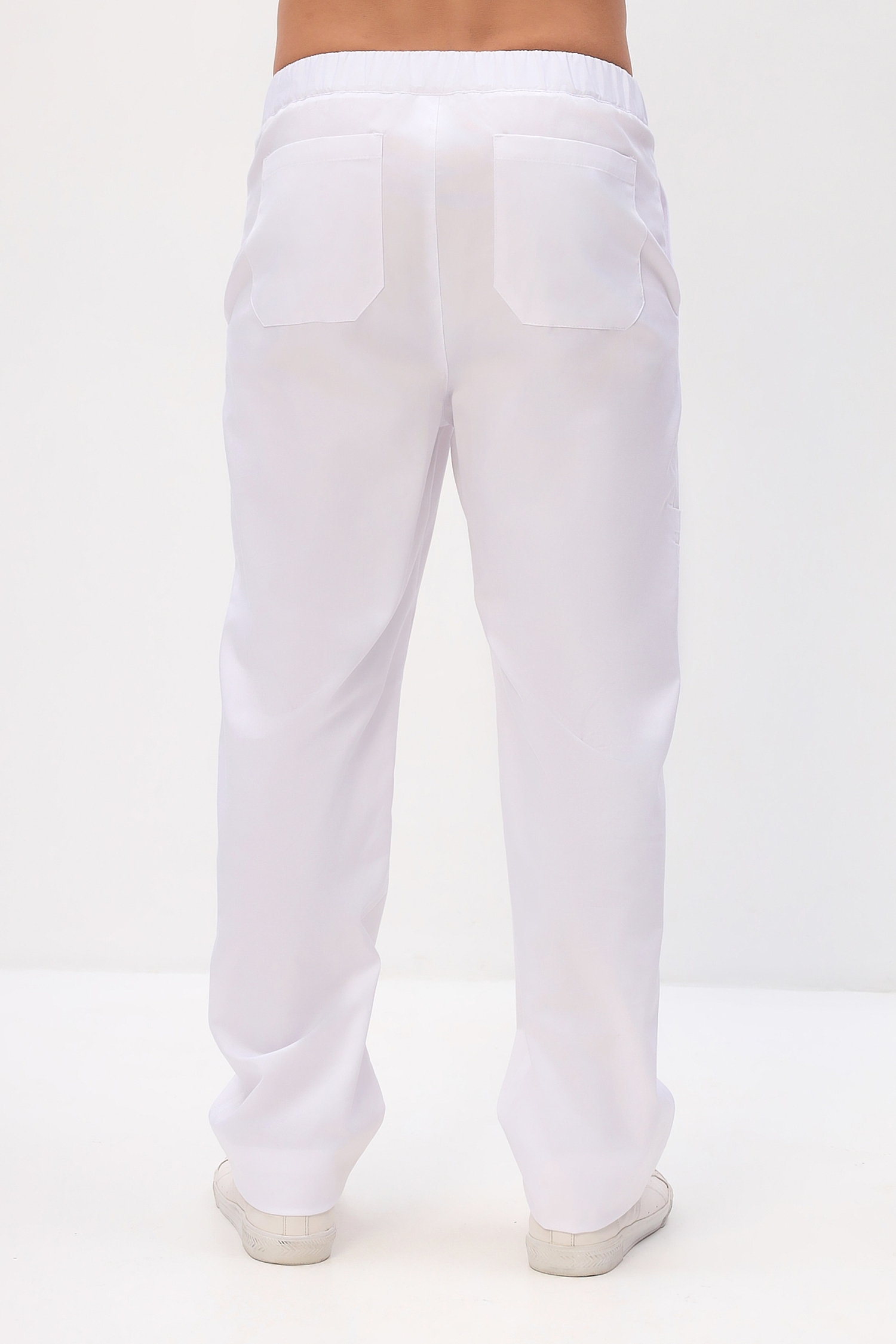 Функциональные мужские медицинские брюки прямого кроя с застежкой на молнию и пуговицу, задняя часть пояса дополнительно стянута эластичной тесьмой (резинка).