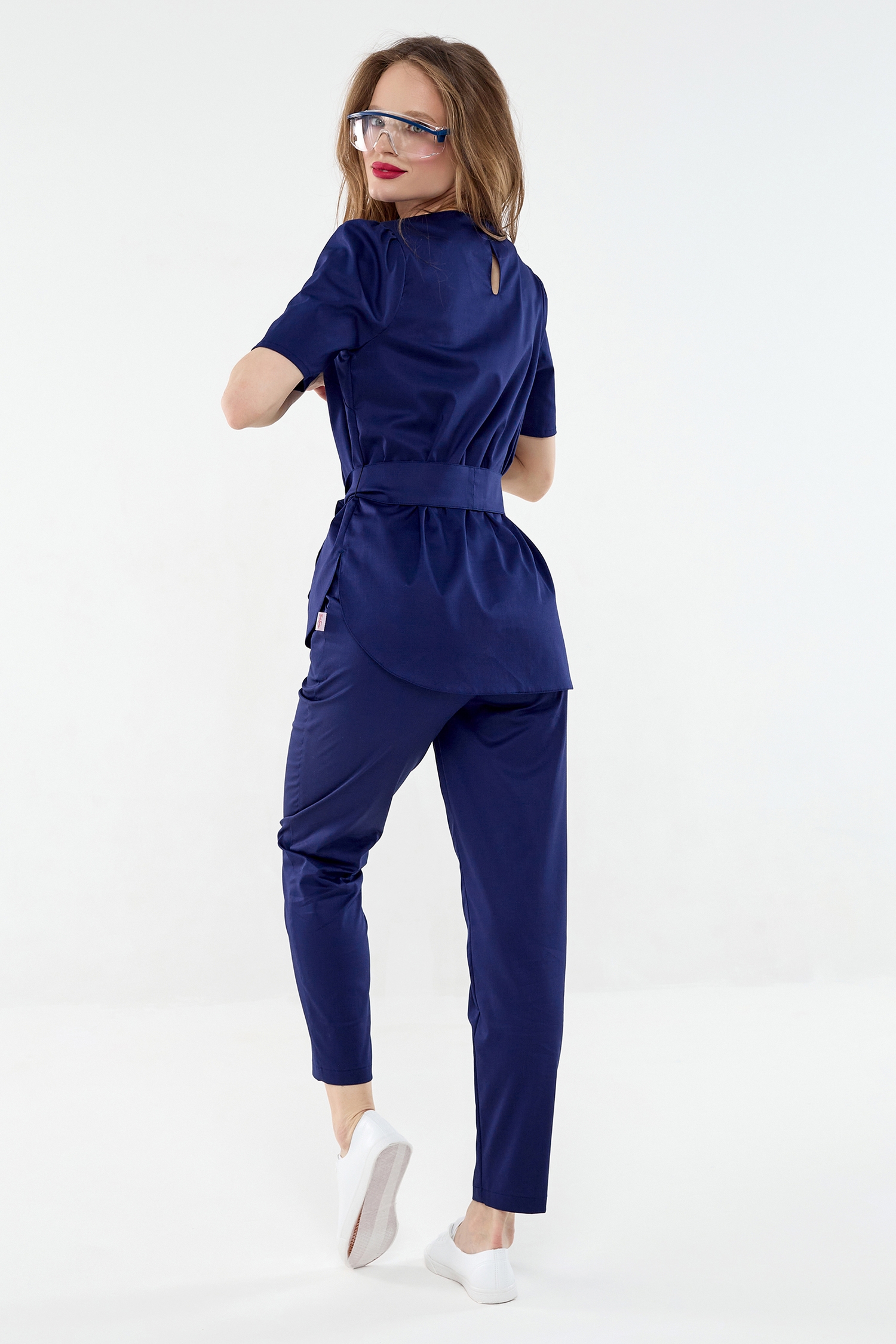Брюки средней посадки, укороченные и зауженные к низу - силуэт TAPERED FIT. Пояс на резинке. Аккуратные но вместительные «французские» карманы, которые плотно прилегают и не оттопыриваются. Отстроченные спереди стрелки, благодаря которым сохраняется форма брюк. Универсальные, сочетаются с любыми блузами и халатами линейки ADVA