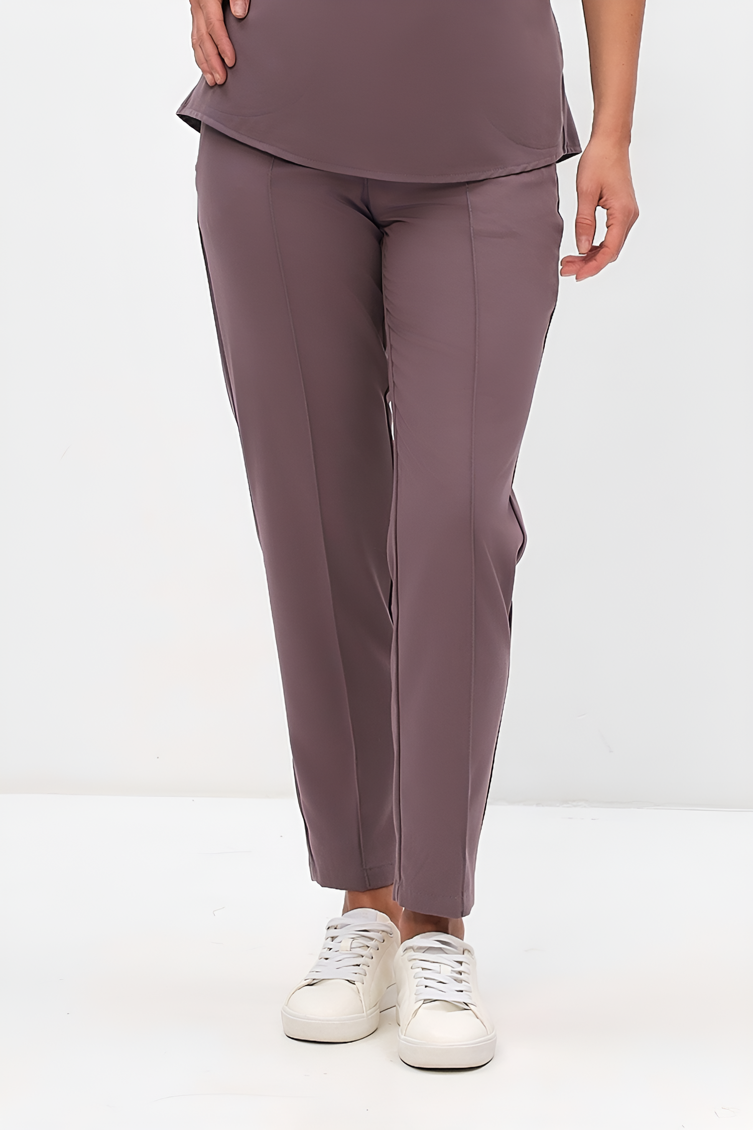 Брюки средней посадки, укороченные и зауженные к низу - силуэт TAPERED FIT. Пояс на резинке. Аккуратные но вместительные «французские» карманы, которые плотно прилегают и не оттопыриваются. Отстроченные спереди стрелки, благодаря которым сохраняется форма брюк. Универсальные, сочетаются с любыми блузами и халатами линейки ADVA