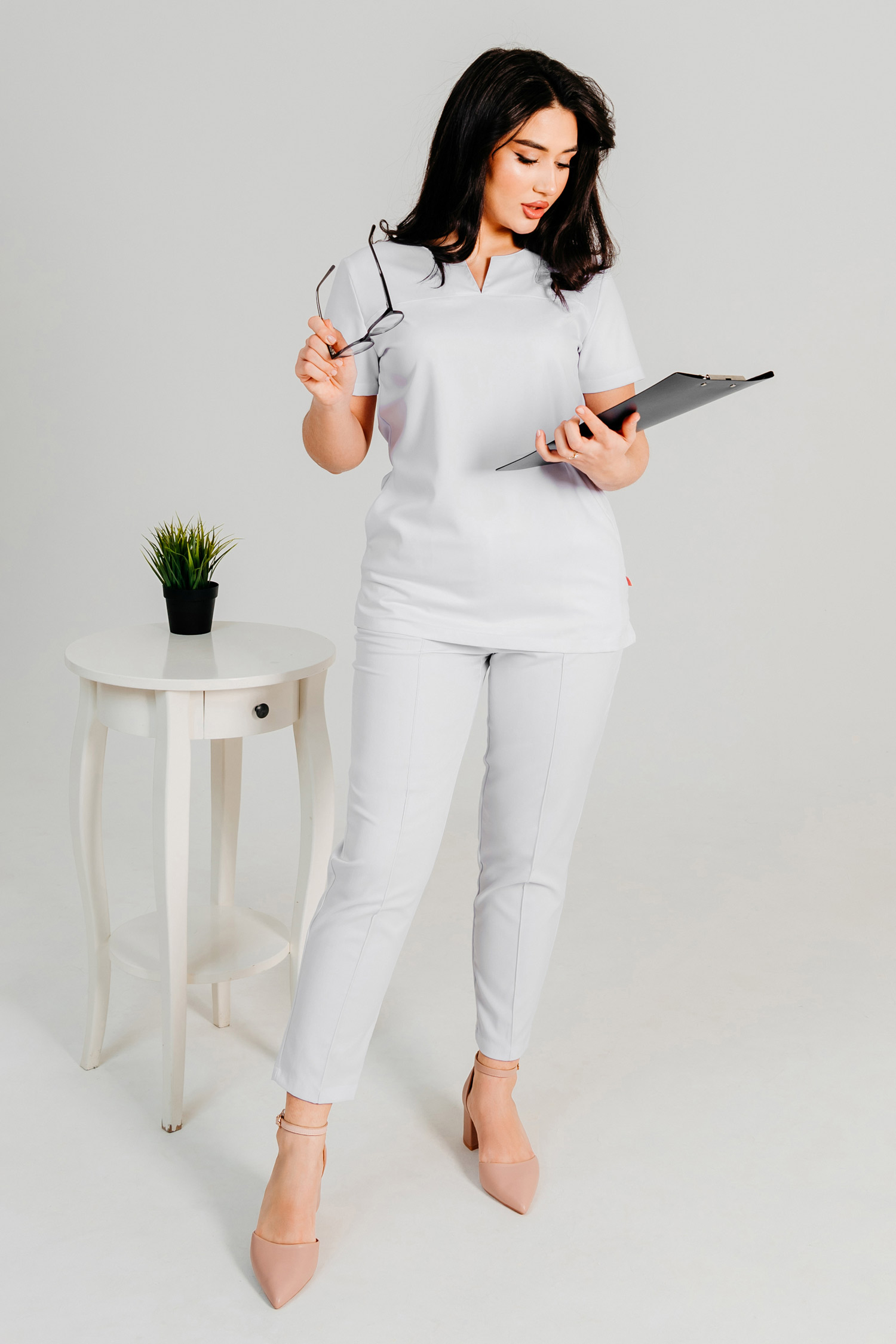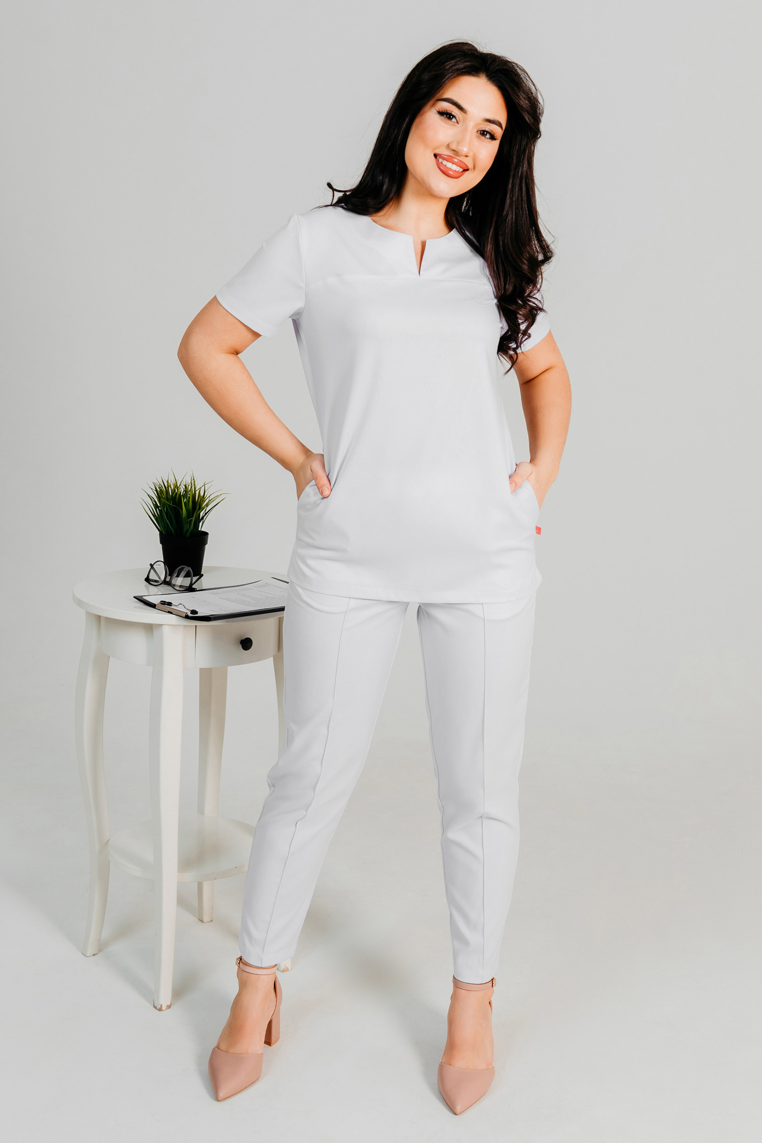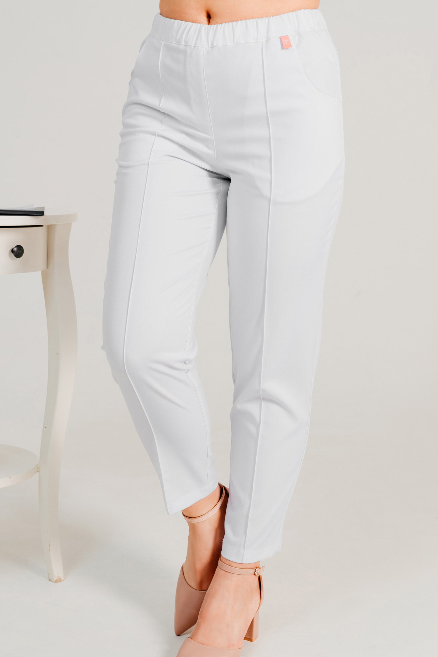 Брюки средней посадки, укороченные и зауженные к низу - силуэт TAPERED FIT. Пояс на резинке. Аккуратные но вместительные «французские» карманы, которые плотно прилегают и не оттопыриваются. Отстроченные спереди стрелки, благодаря которым сохраняется форма брюк. Универсальные, сочетаются с любыми блузами и халатами линейки ADVA