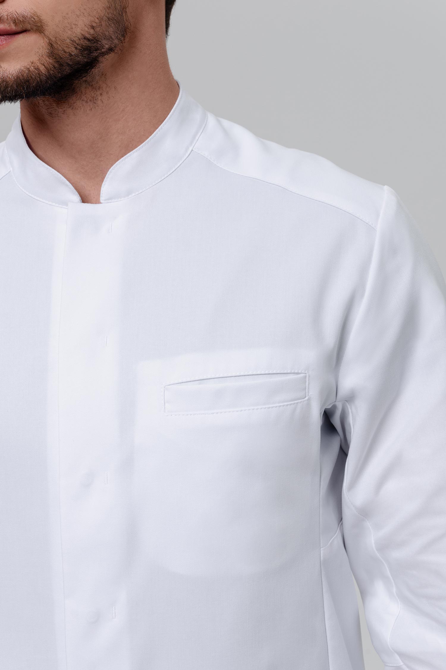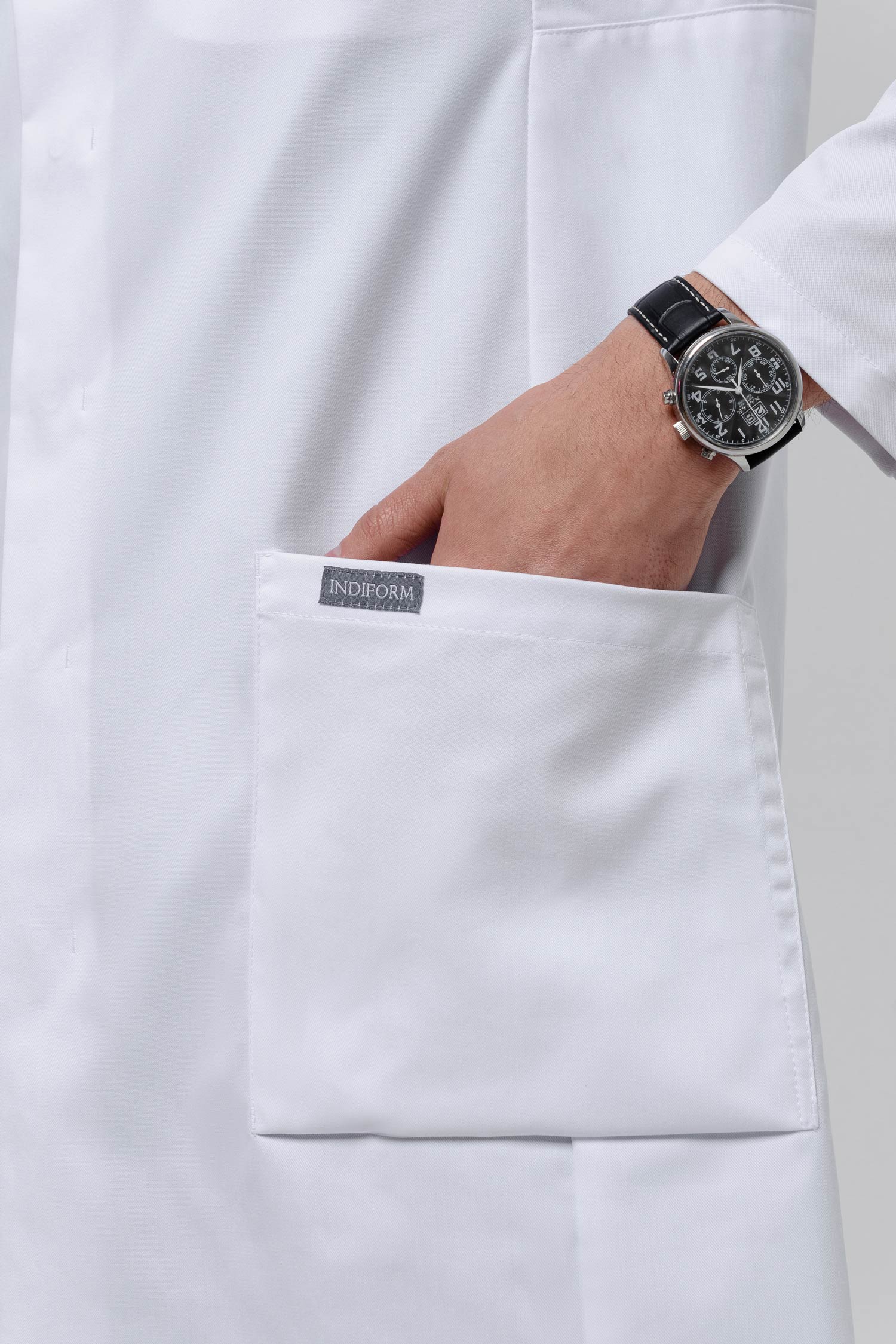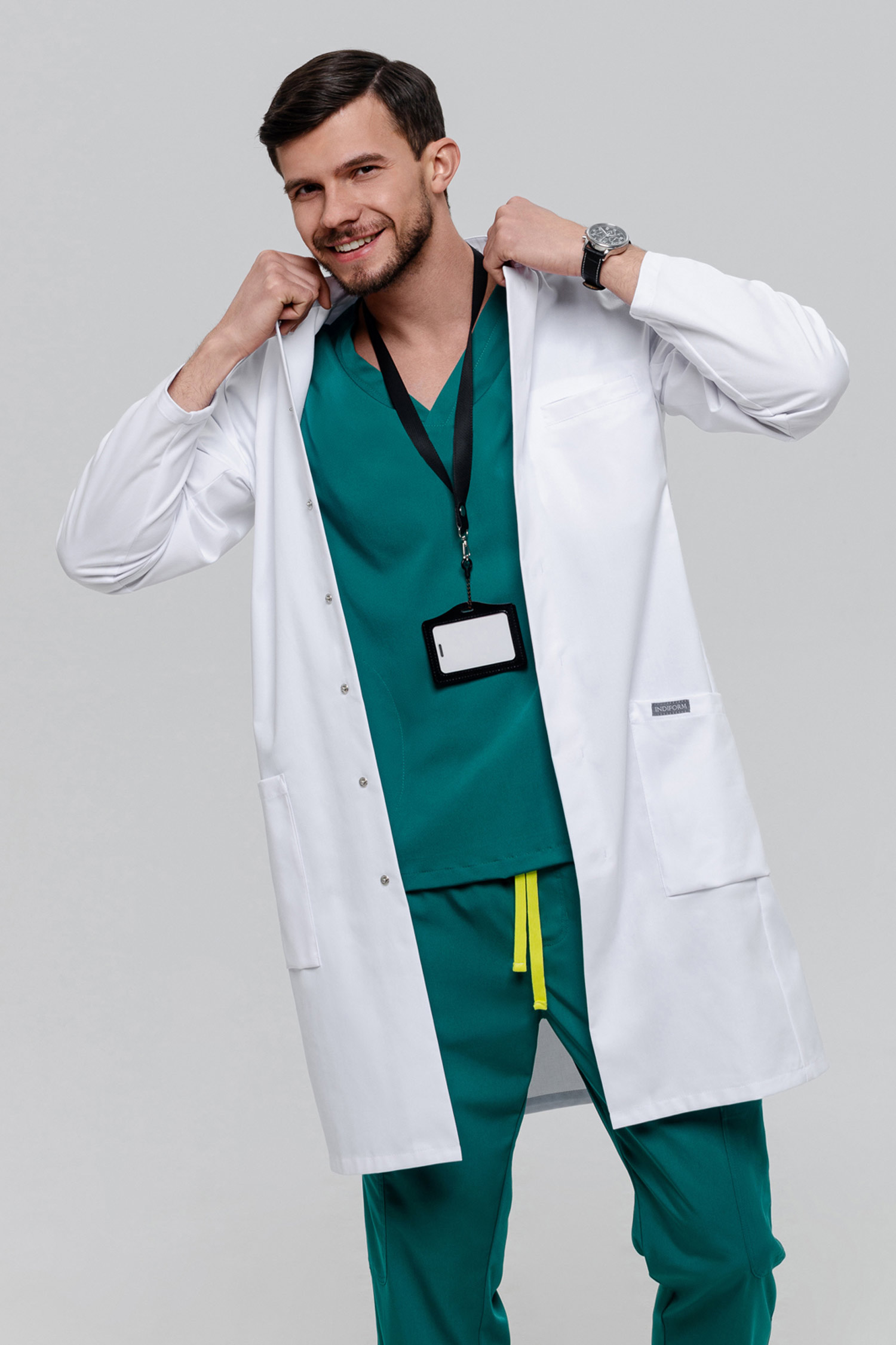 Современный медицинский халат прямого силуэта с потайной застежкой на кнопки. Особый крой рукавов (цельнокроеная с бочком халата внутренняя часть плюс вставка из трикотажного полотна) дает дополнительный комфорт в движении. В среднем шве спинки – шлица. Накладные карманы вместительные за счет своей конструкции, при этом держат форму, не провисают.