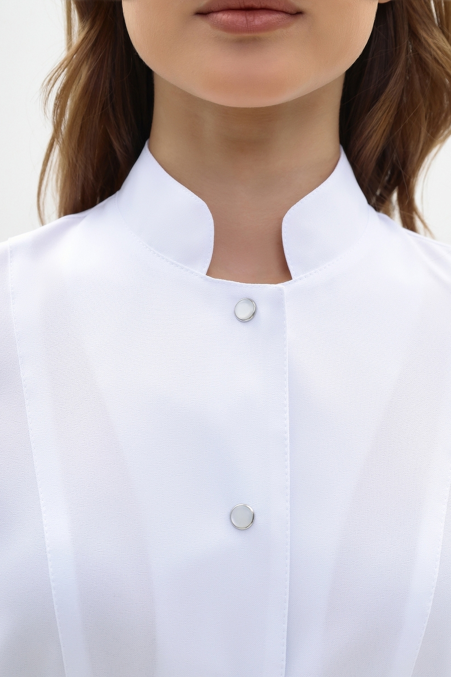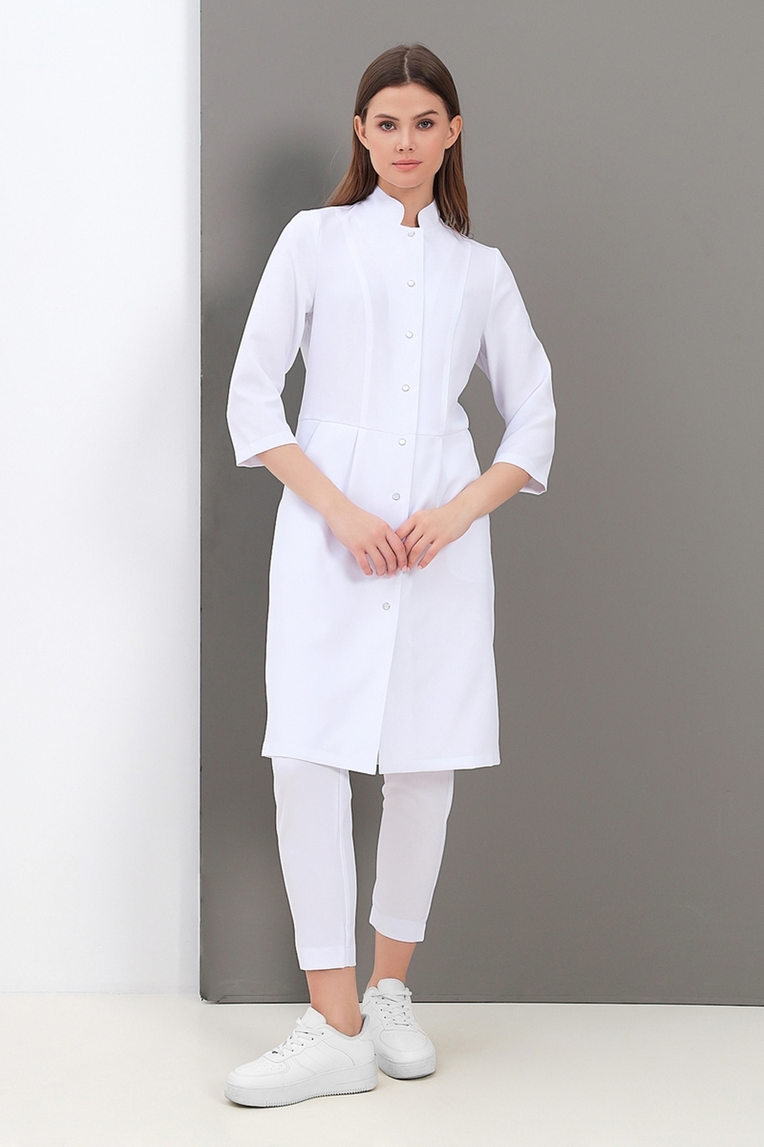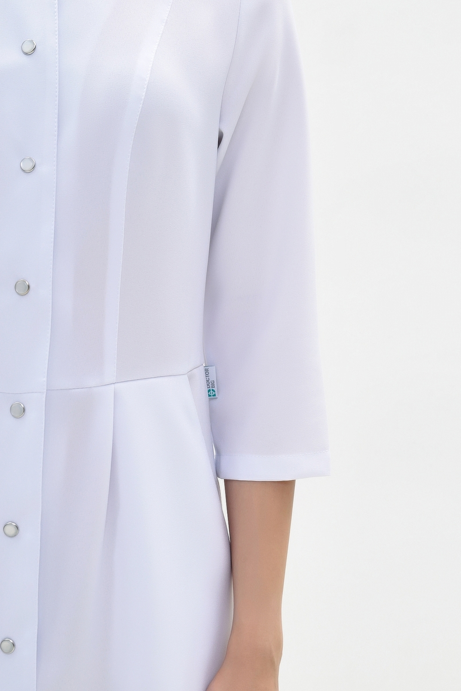 Медицинский халат полуприлегающего силуэта с воротником стойкой, застежкой на кнопки и длиной до колен. Отрезной по талии, спереди на талии заложены складки. Боковые карманы с наклонным входом.
