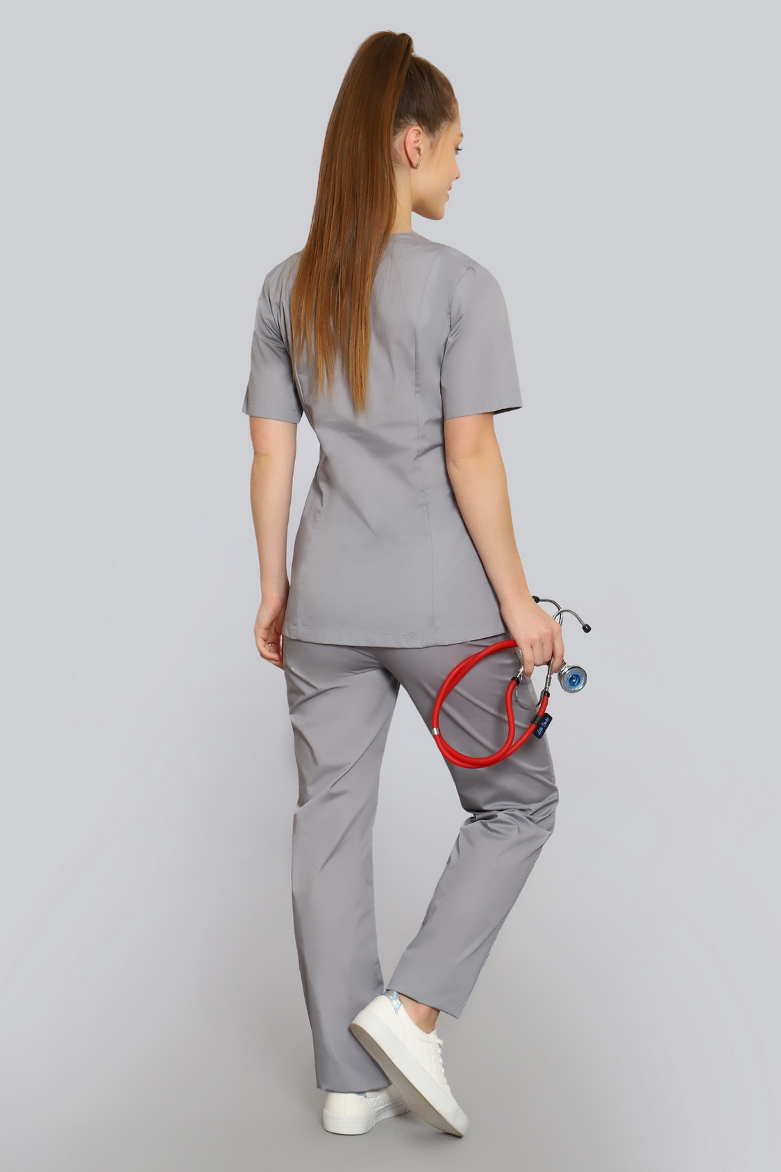 Базовый хирургический костюм состоит из топа и брюк. Топ полуприлегающего силуэта с рельефами на полочке и спинке и длиной ниже уровня бедер. Есть два удобных боковых кармана и один нагрудный.