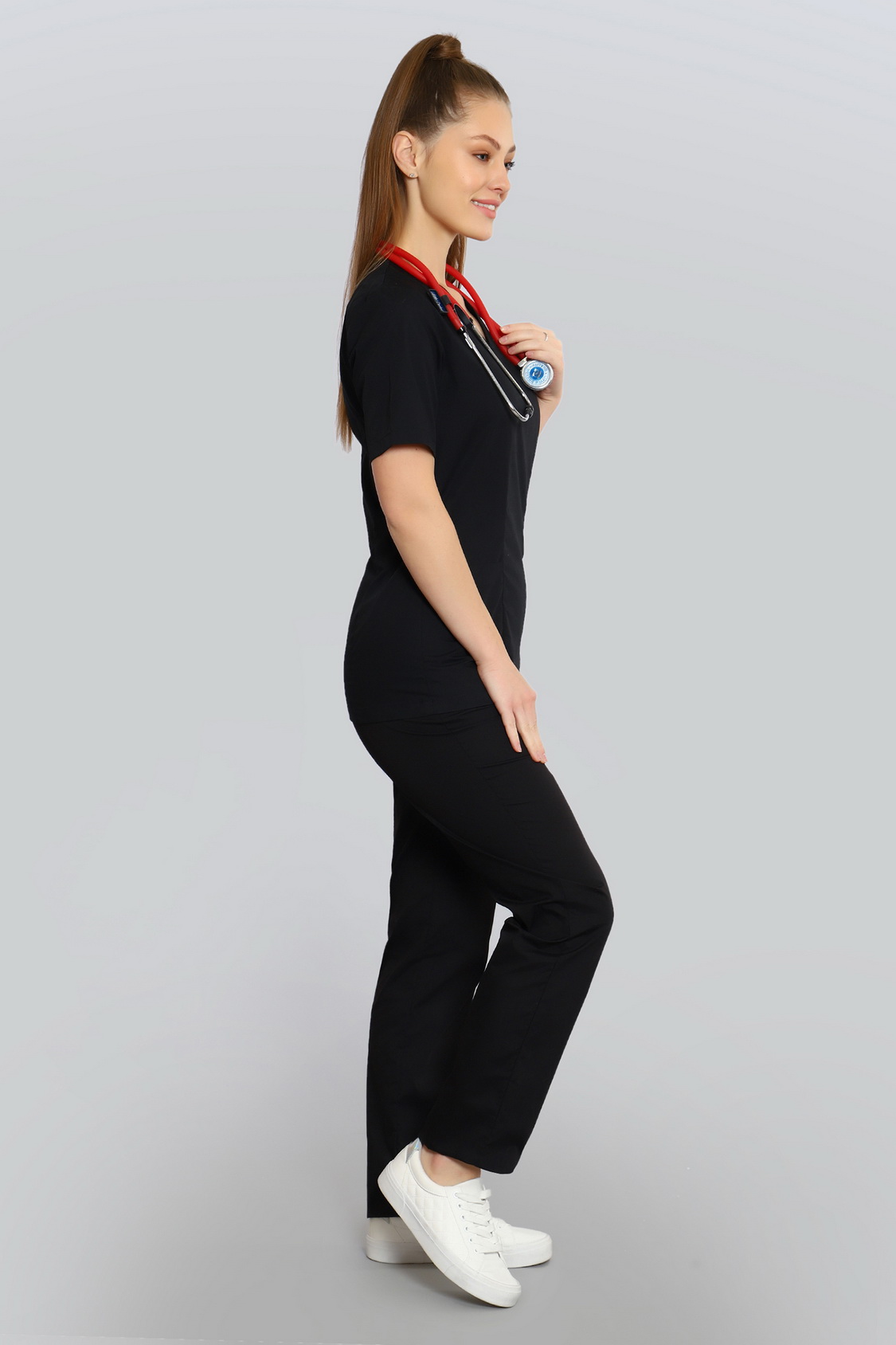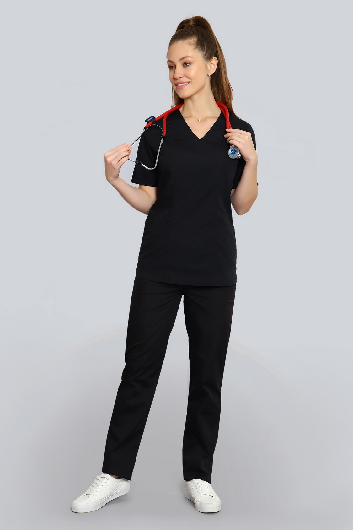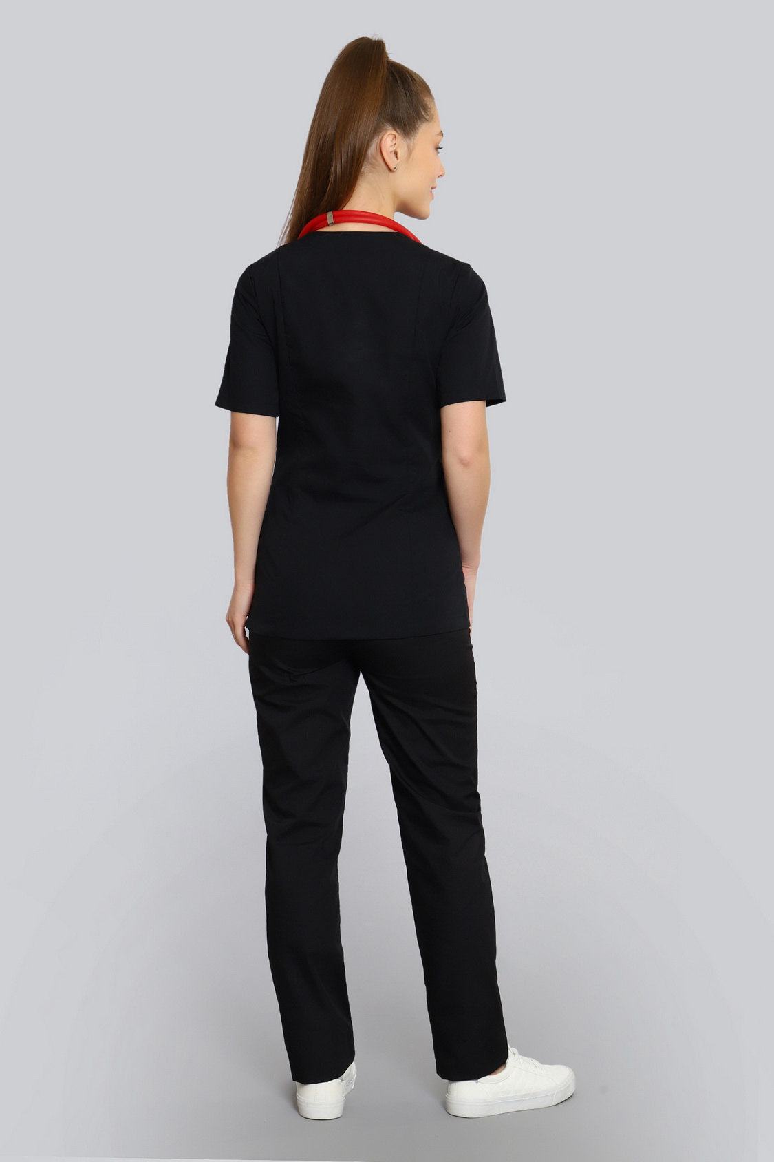 Базовый хирургический костюм состоит из топа и брюк. Топ полуприлегающего силуэта с рельефами на полочке и спинке и длиной ниже уровня бедер. Есть два удобных боковых кармана и один нагрудный.