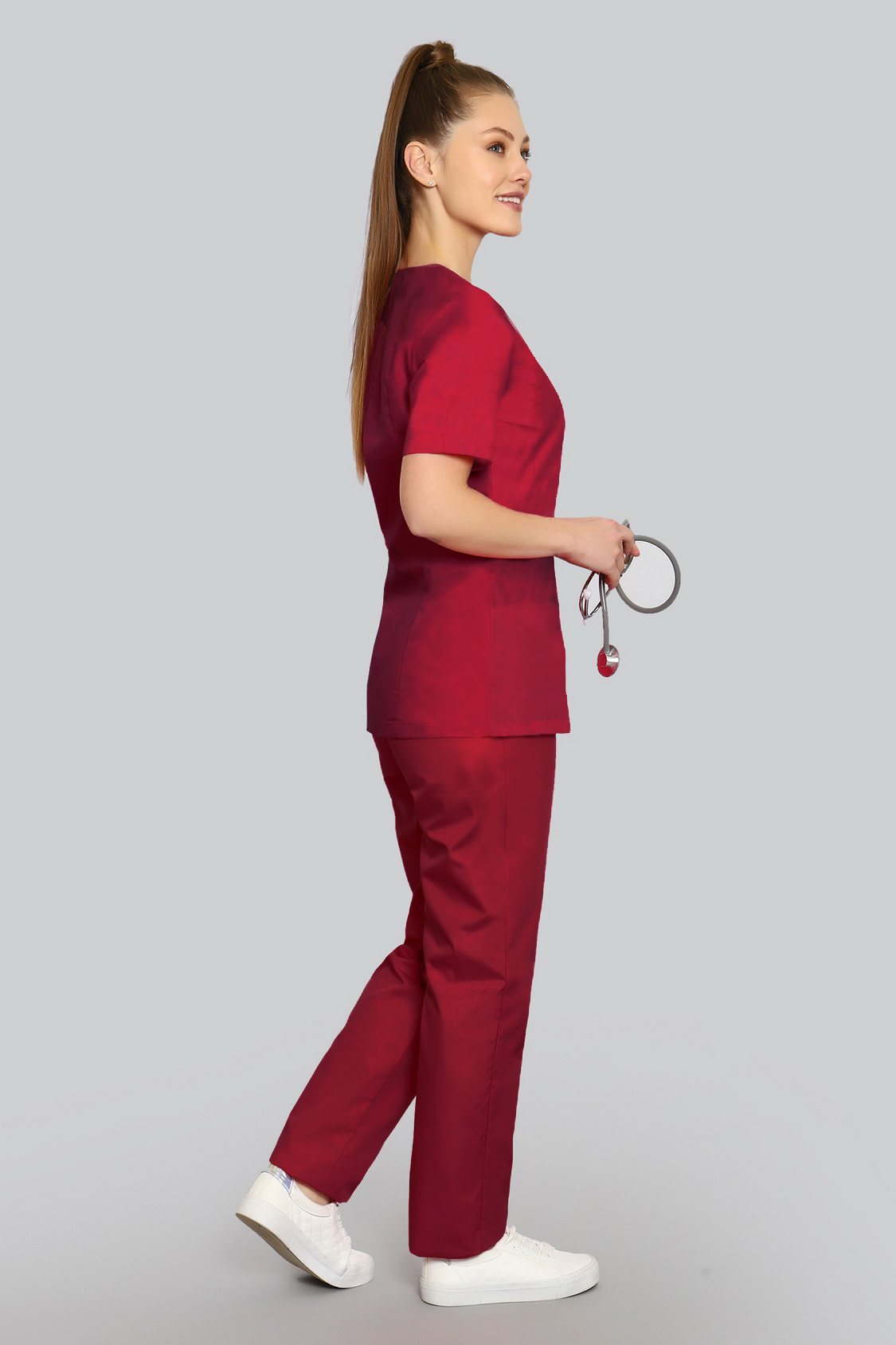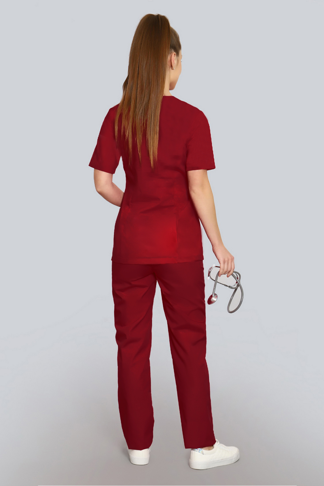 Базовый хирургический костюм состоит из топа и брюк. Топ полуприлегающего силуэта с рельефами на полочке и спинке и длиной ниже уровня бедер. Есть два удобных боковых кармана и один нагрудный.