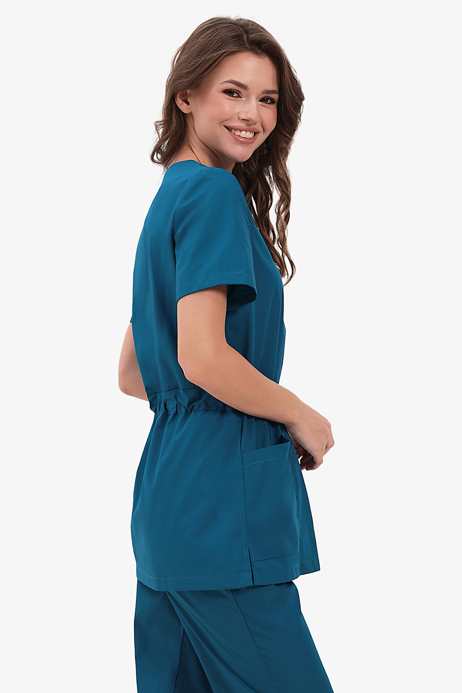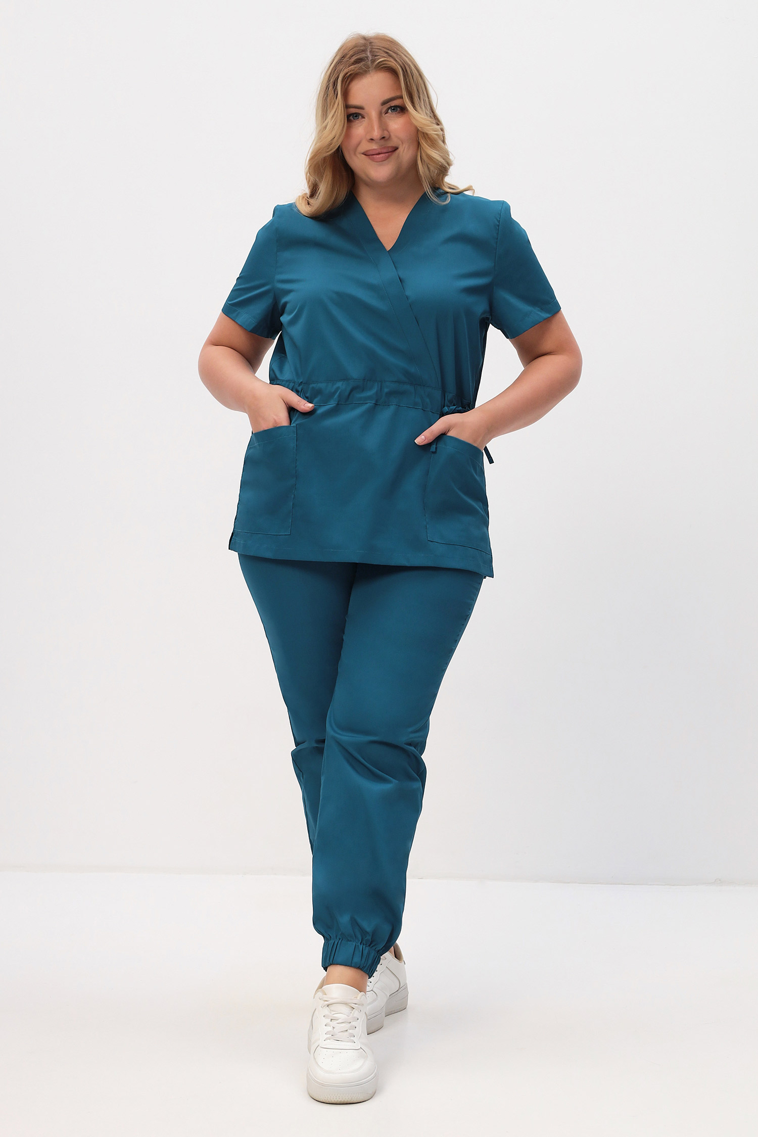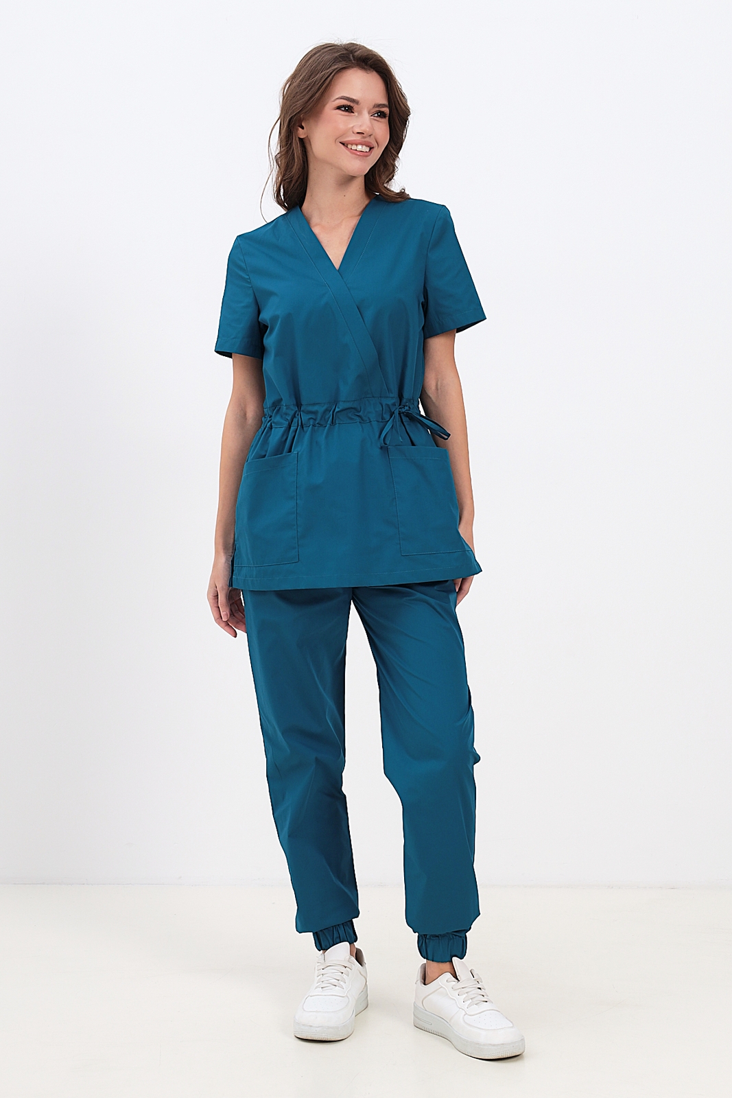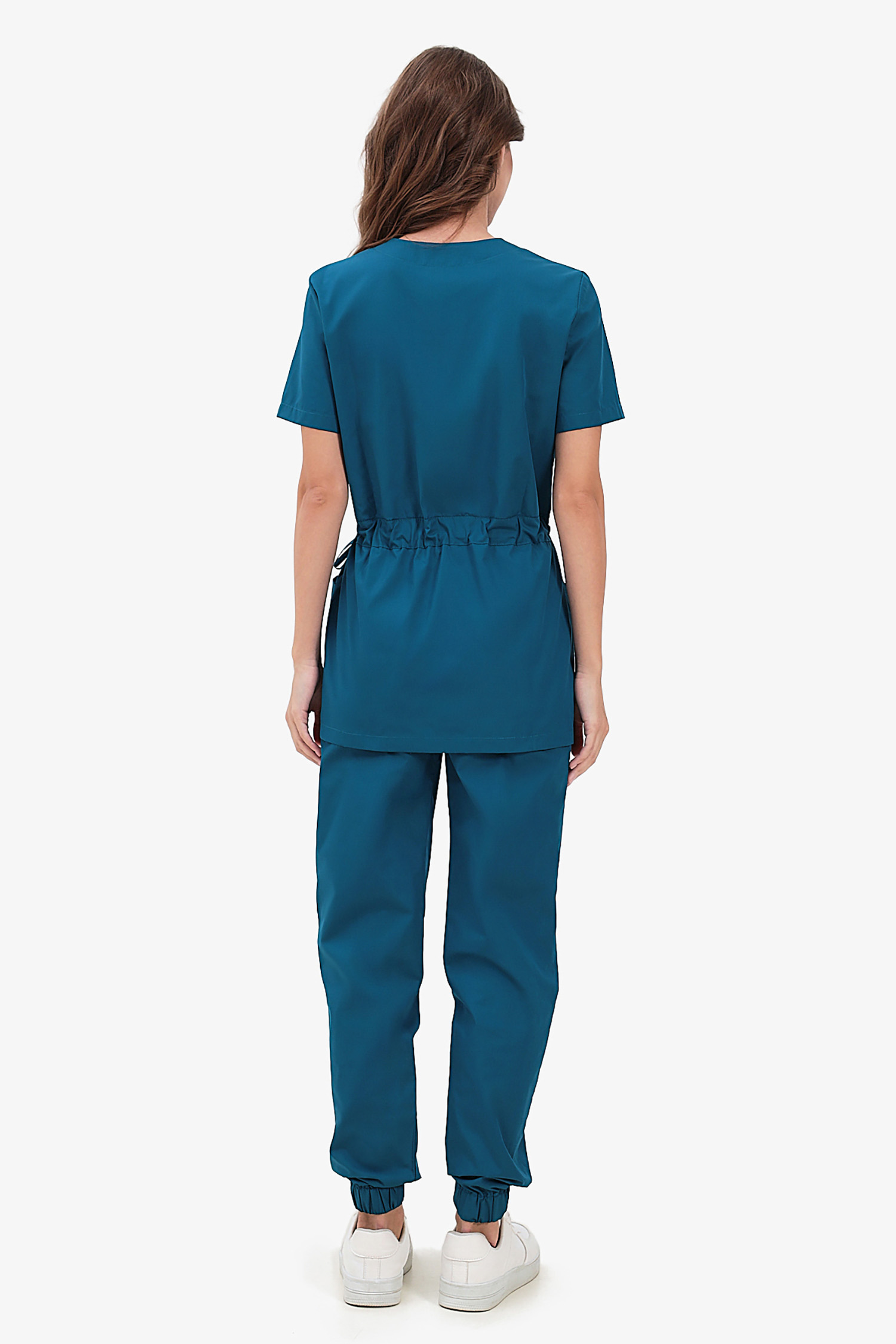 Современный медицинский костюм состоит из топа и брюк. Топ полуприлегающий, полочки с запахом; запах зафиксирован строчкой (чтобы не расходился). Топ отрезной по талии, с регулировкой объема с помощью кулиски и шнура. Есть два удобных боковых накладных кармана и разрезы в боковых швах. Брюки – джогеры, пояс на комфортной резинке.