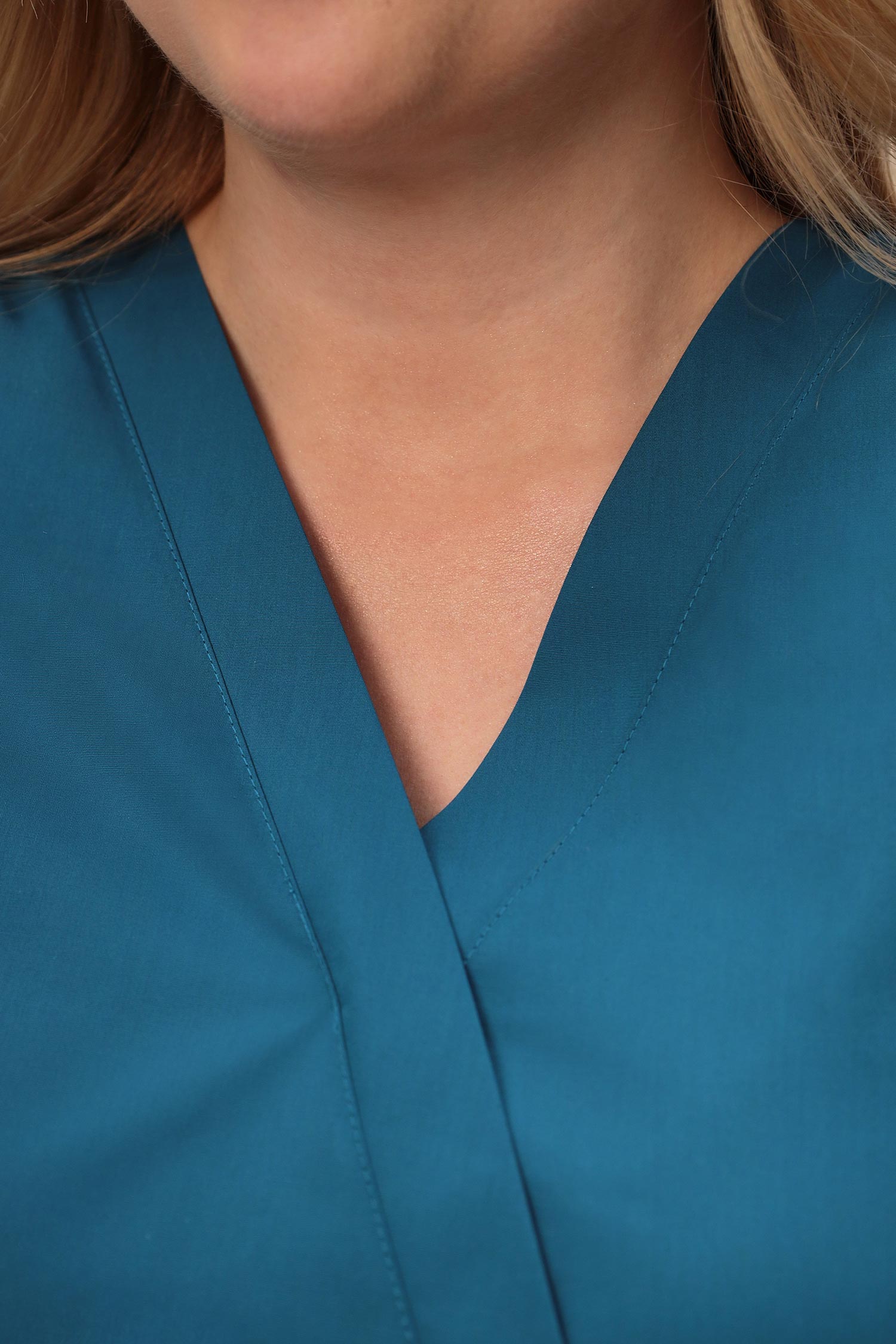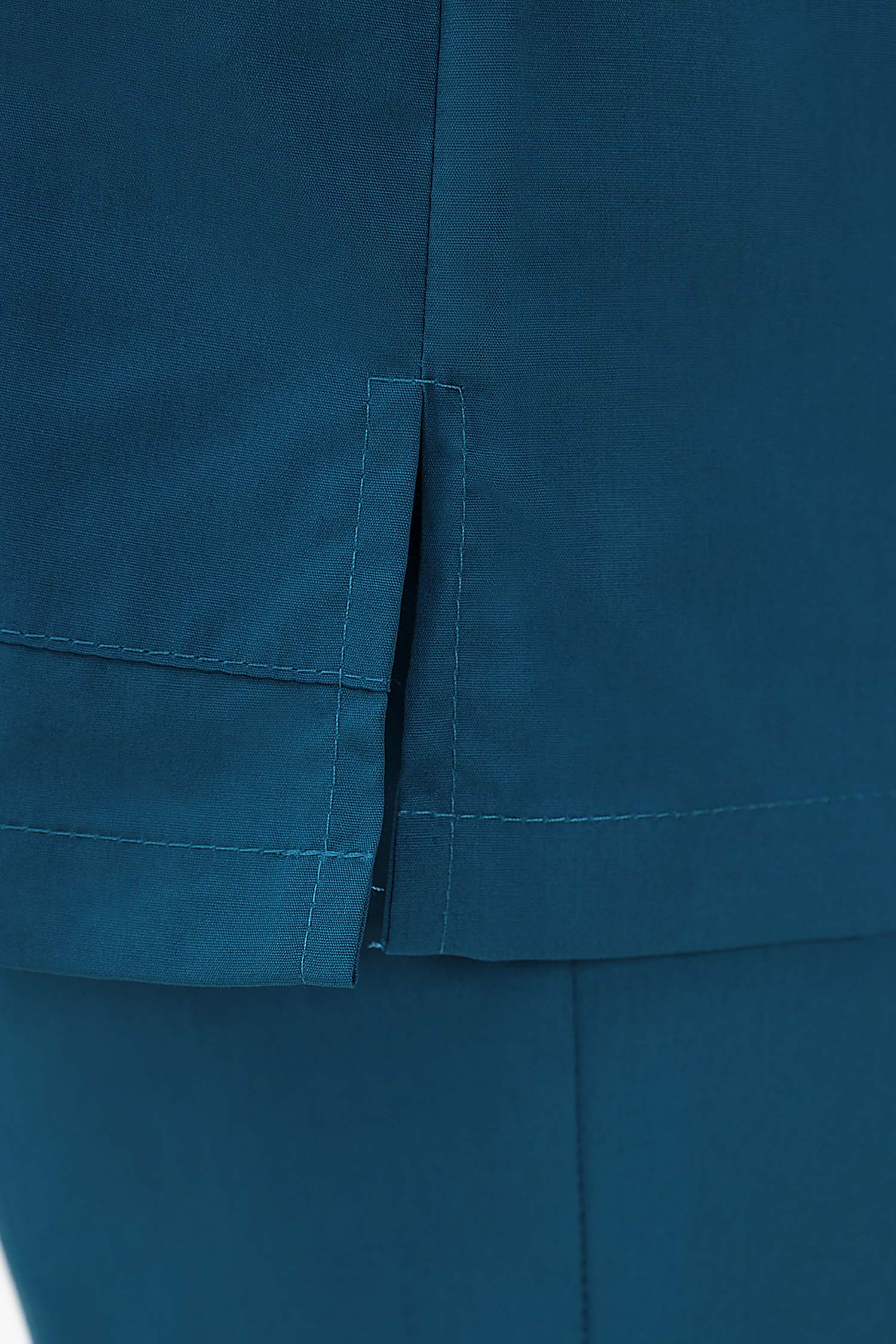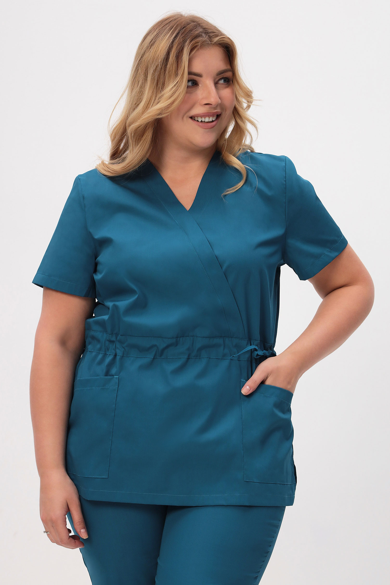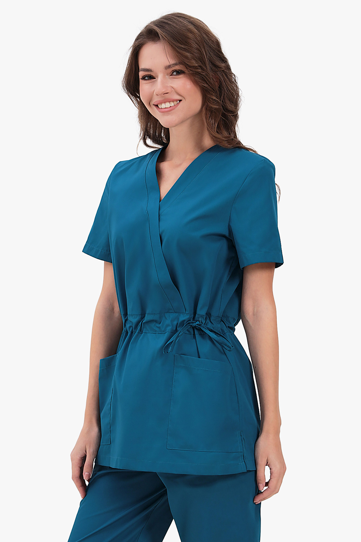 Современный медицинский костюм состоит из топа и брюк. Топ полуприлегающий, полочки с запахом; запах зафиксирован строчкой (чтобы не расходился). Топ отрезной по талии, с регулировкой объема с помощью кулиски и шнура. Есть два удобных боковых накладных кармана и разрезы в боковых швах. Брюки – джогеры, пояс на комфортной резинке.
