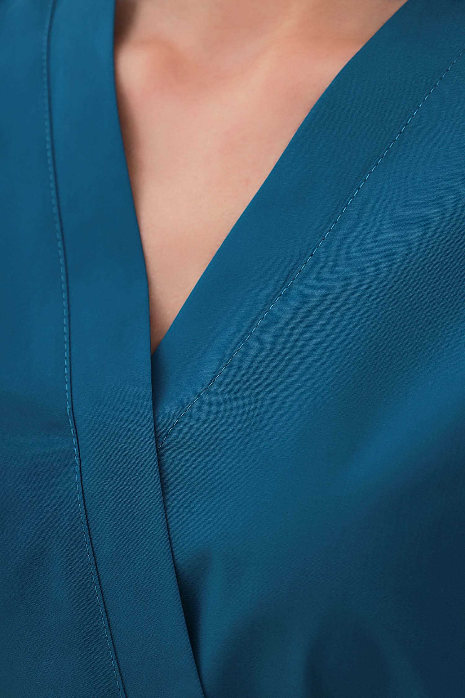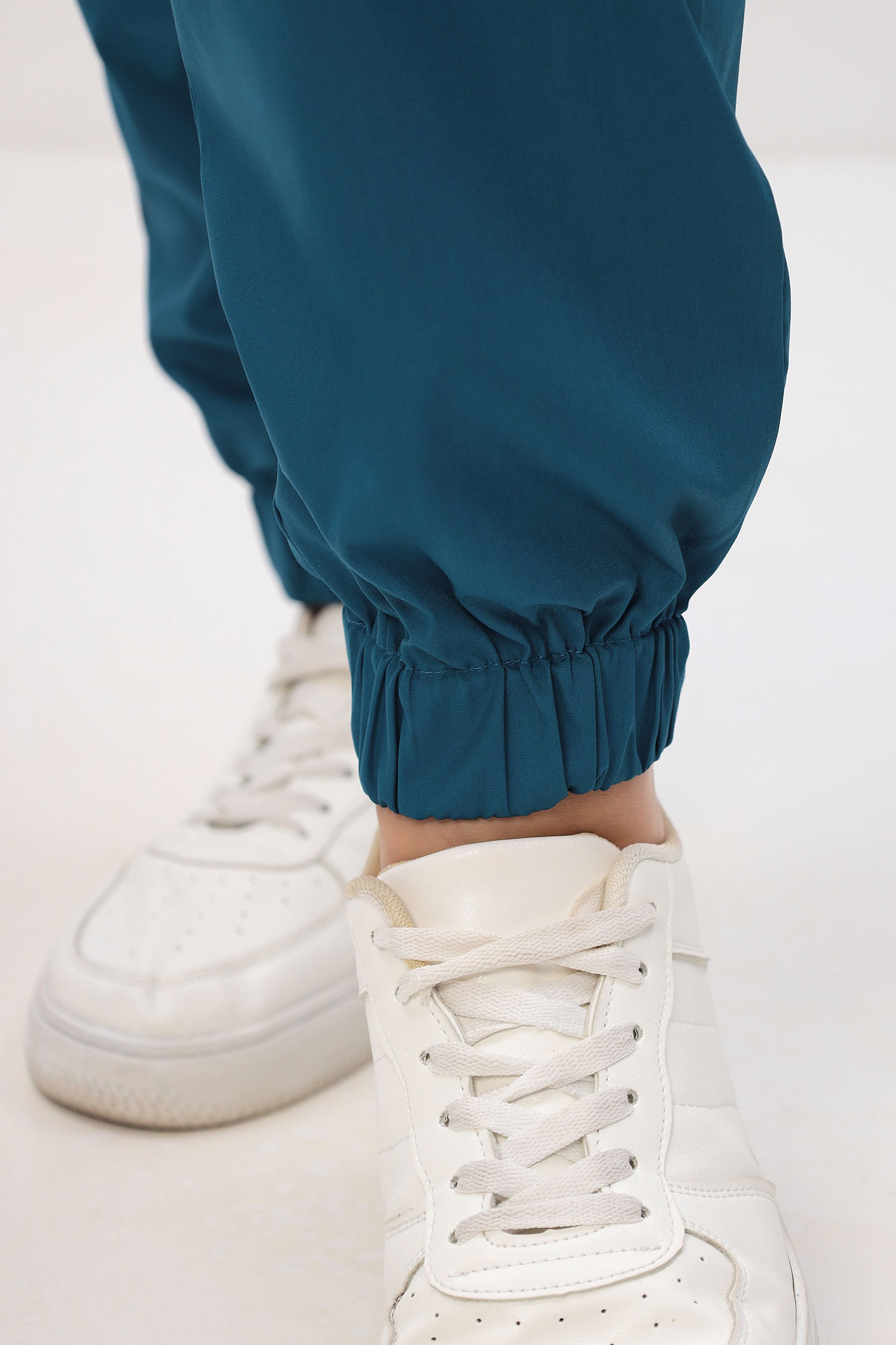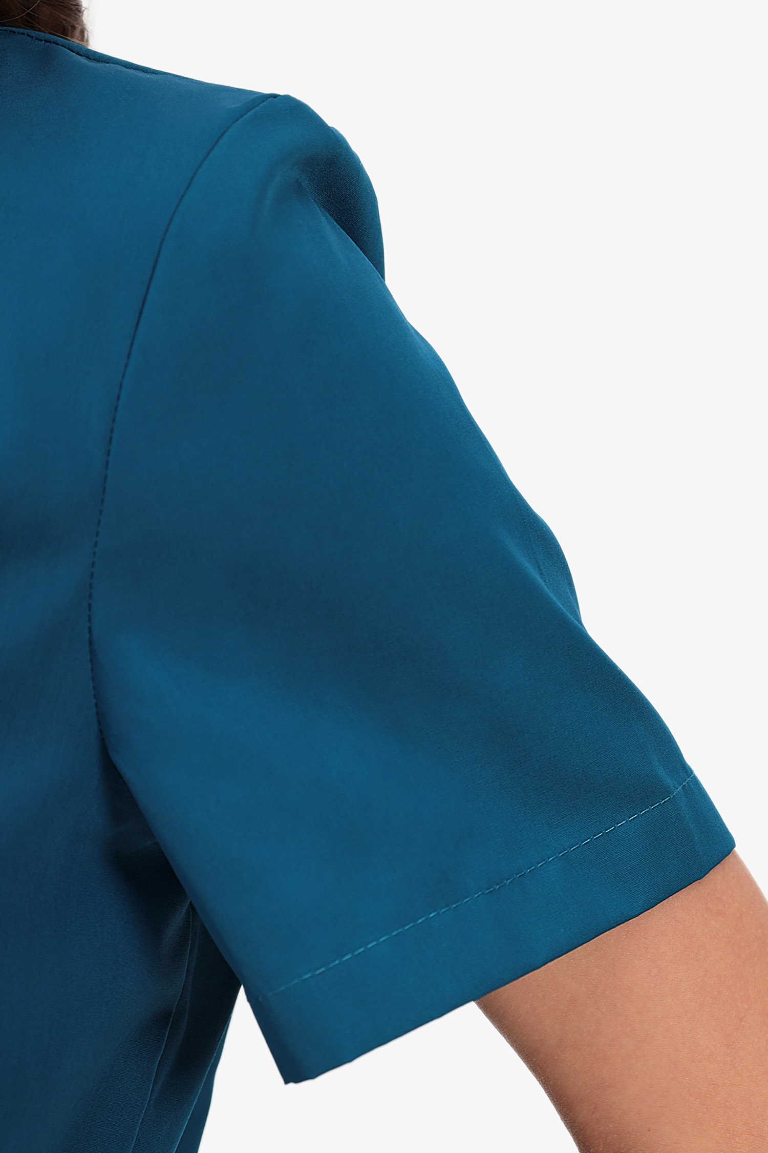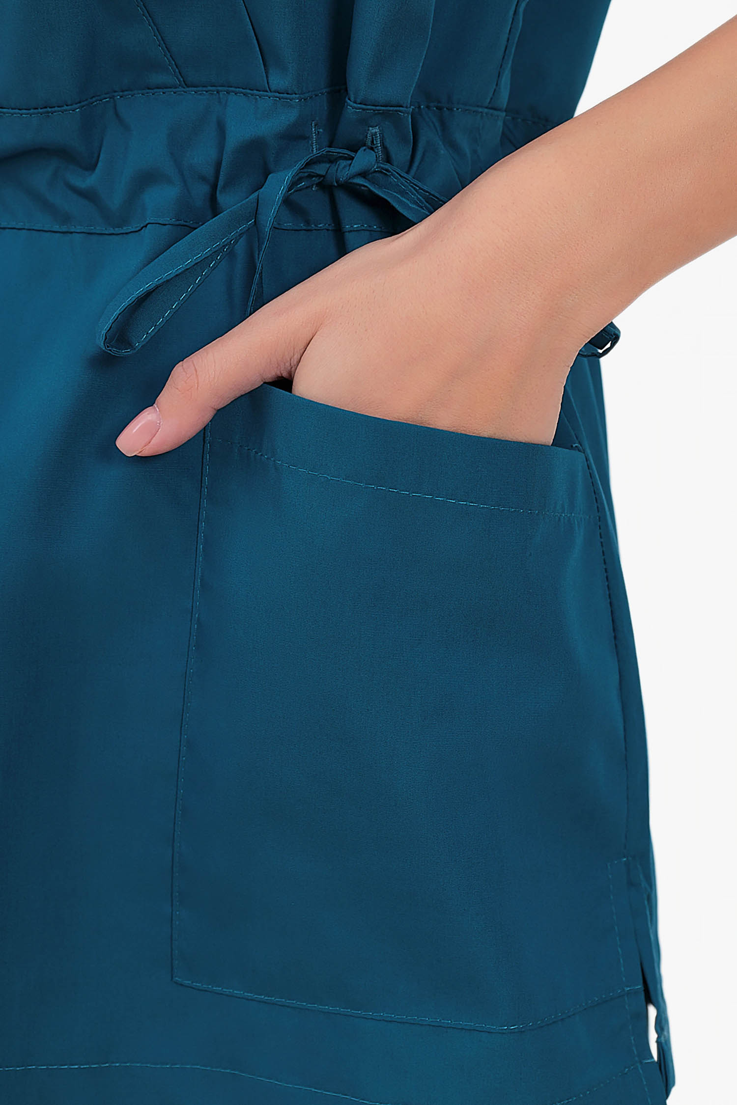 Современный медицинский костюм состоит из топа и брюк. Топ полуприлегающий, полочки с запахом; запах зафиксирован строчкой (чтобы не расходился). Топ отрезной по талии, с регулировкой объема с помощью кулиски и шнура. Есть два удобных боковых накладных кармана и разрезы в боковых швах. Брюки – джогеры, пояс на комфортной резинке.