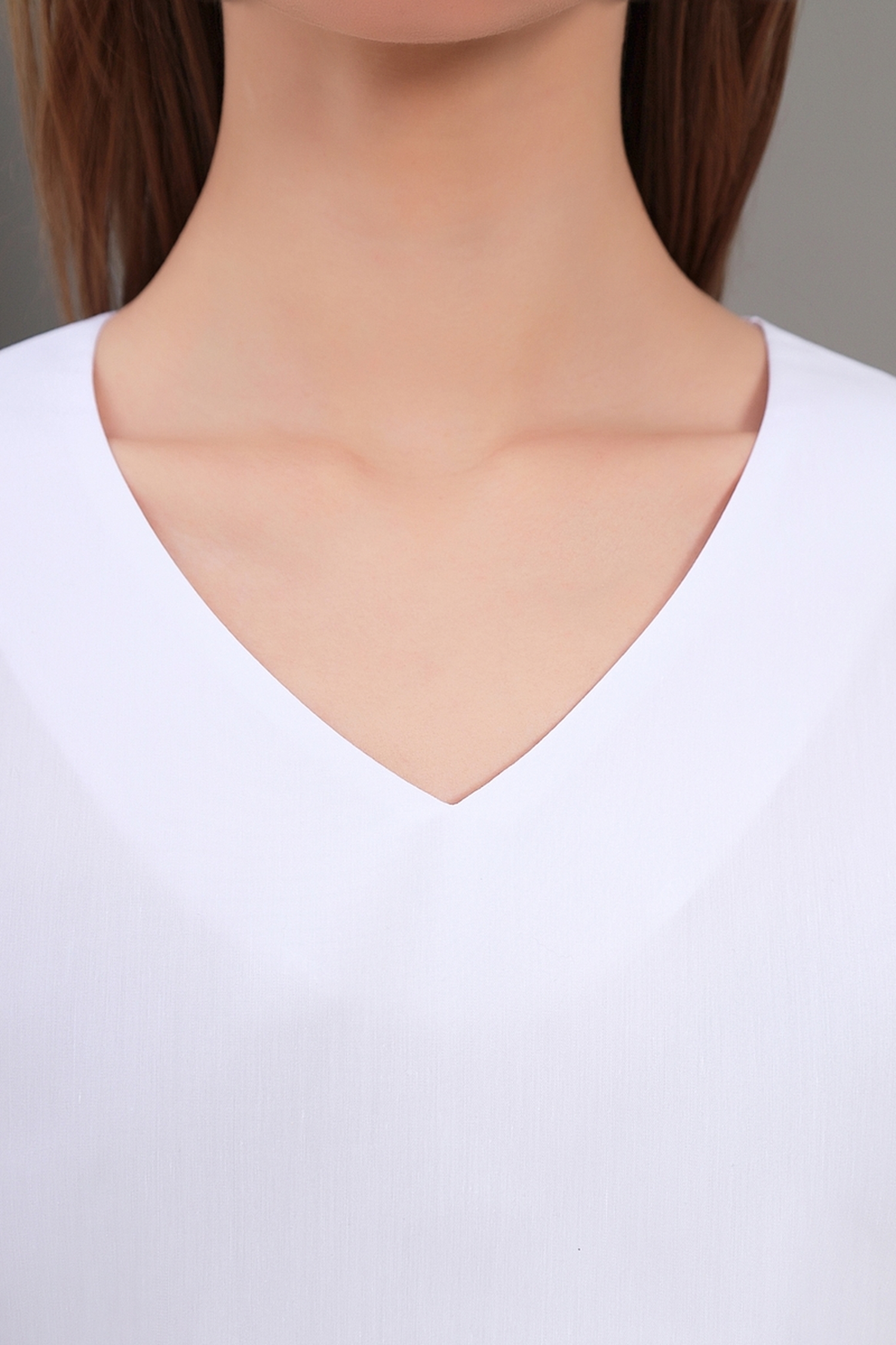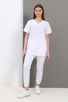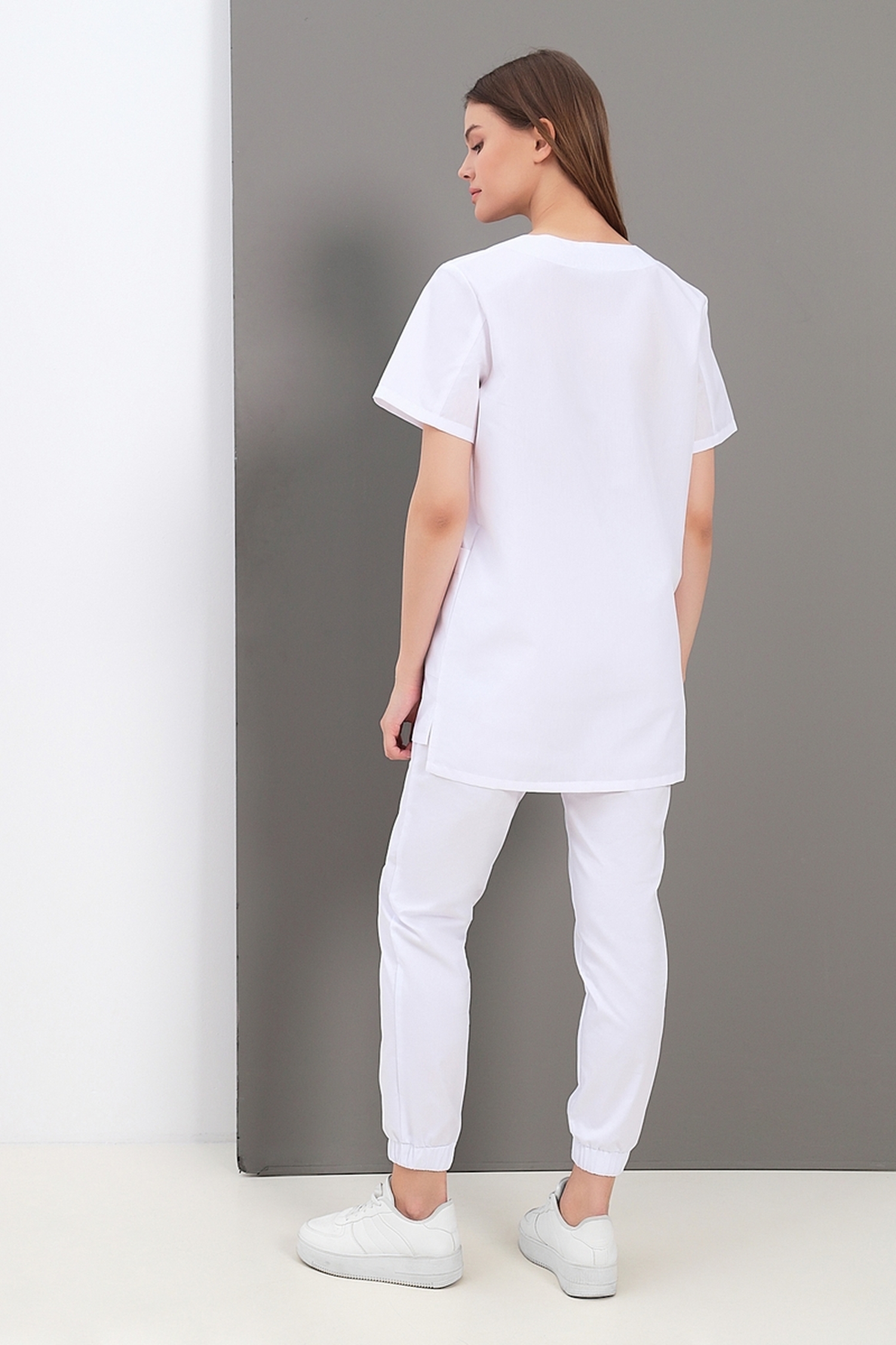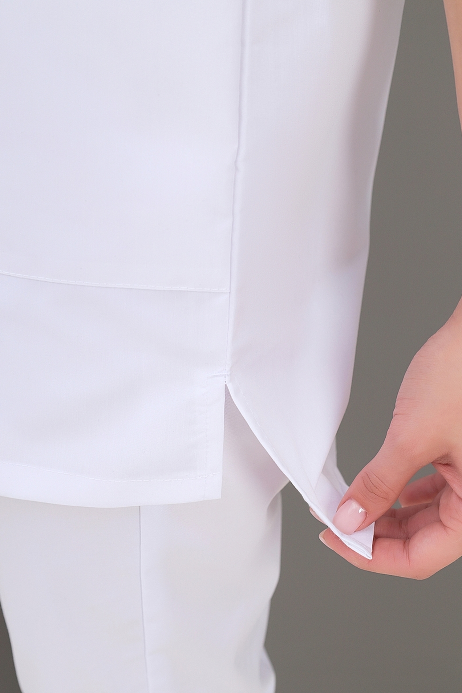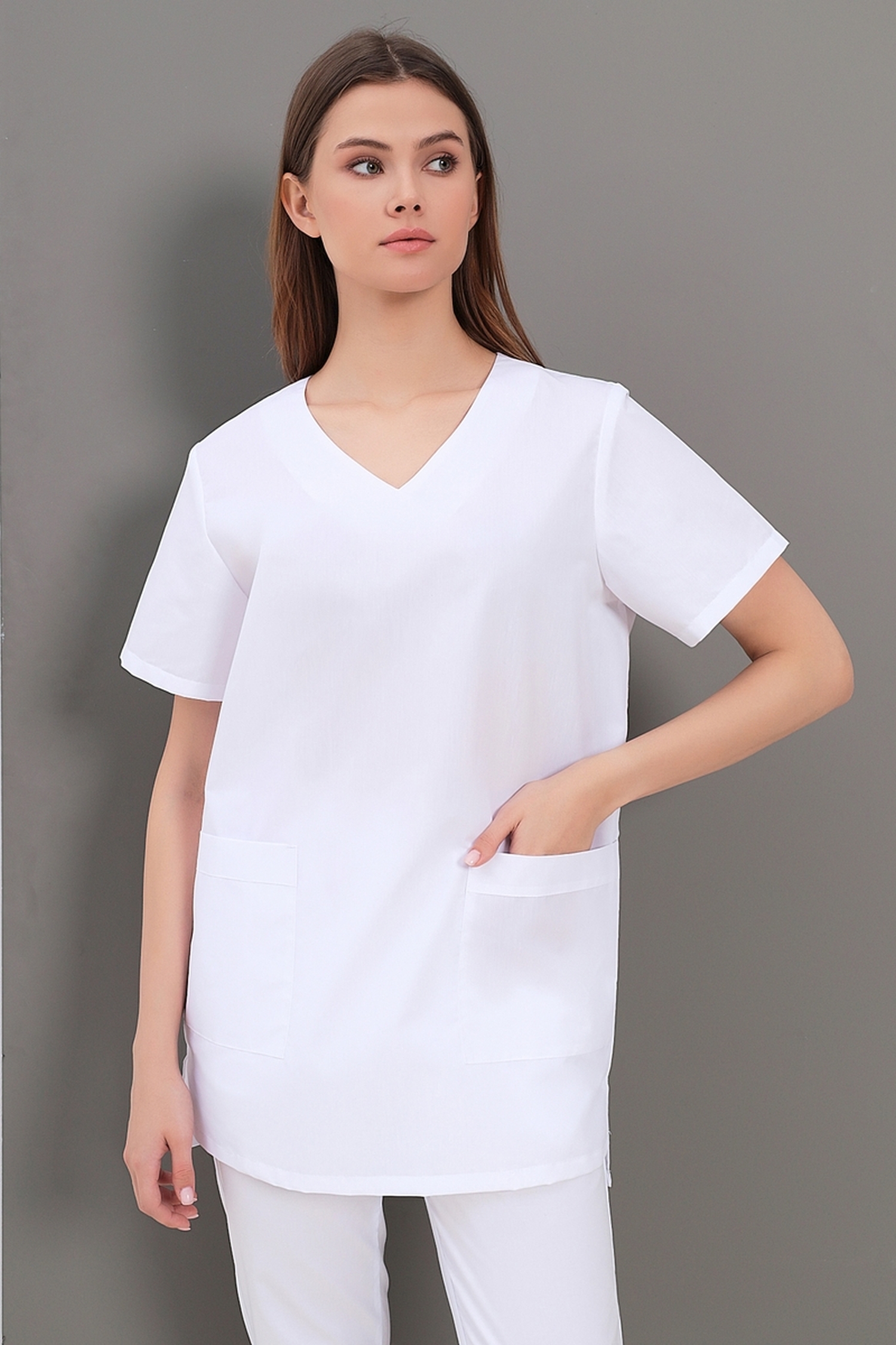 Современный хирургический костюм состоит из топа и брюк. Топ свободный (оверсайз), прямой, удлиненный, два удобных боковых накладных кармана и разрезы в боковых швах. Асимметричный низ.
