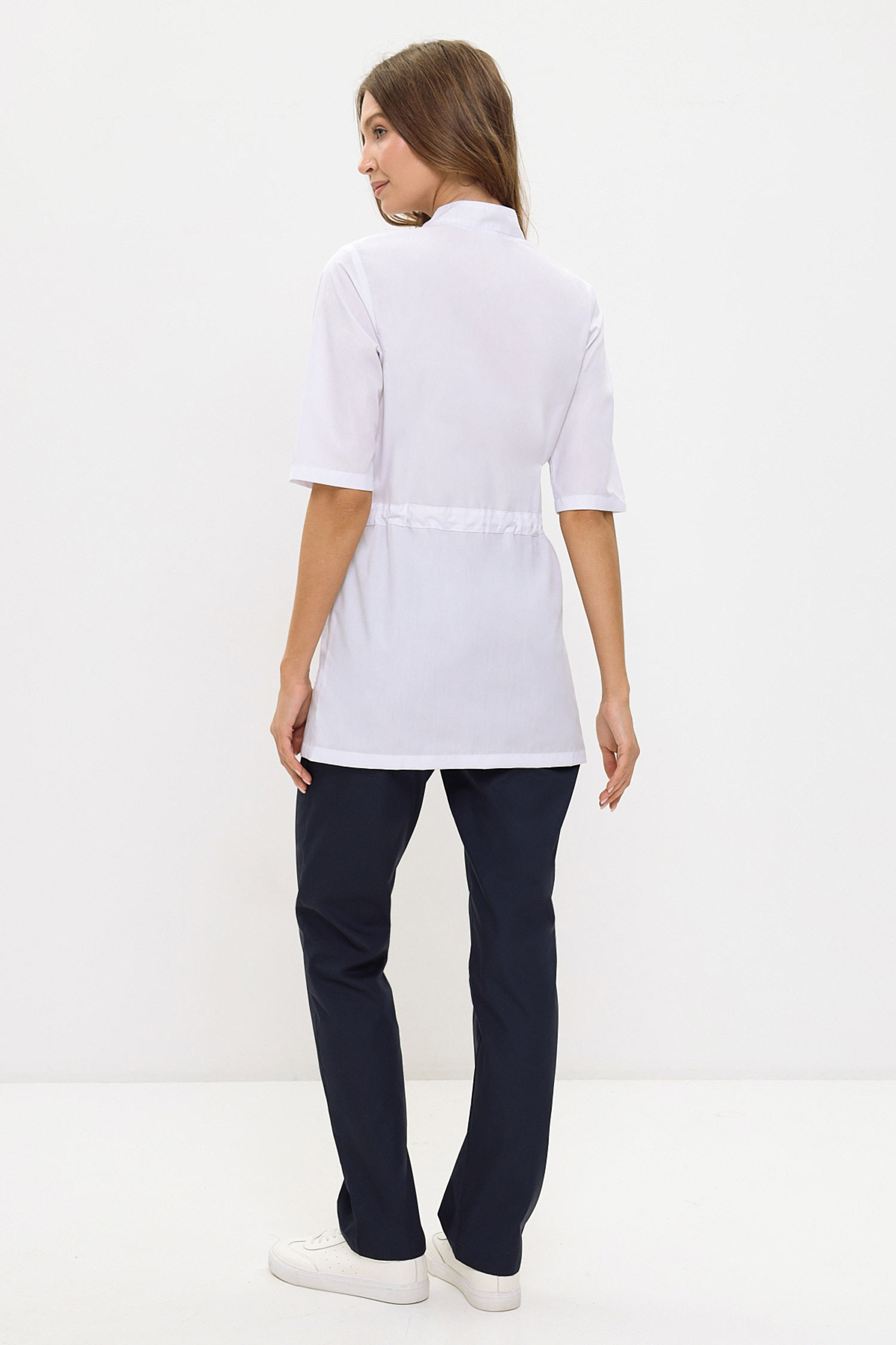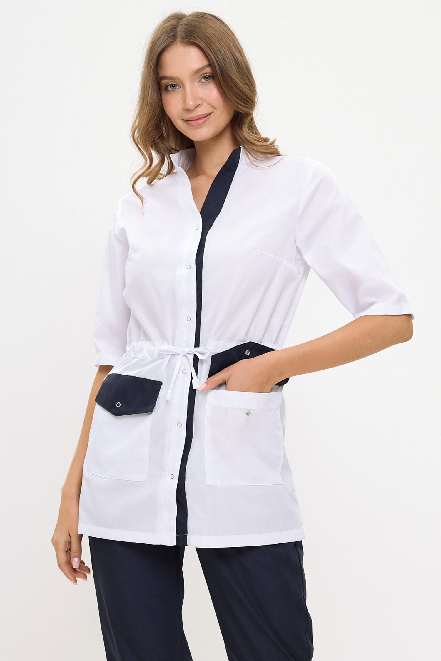 Современный медицинский костюм состоит из блузона и брюк. Блузон прямого силуэта длиной до уровня бедер, с регулировкой степени прилегания по талии с помощью кулиски и шнура. Есть два удобных накладных кармана с клапанами. Застежка – на кнопки. Рукав длиной до локтя.