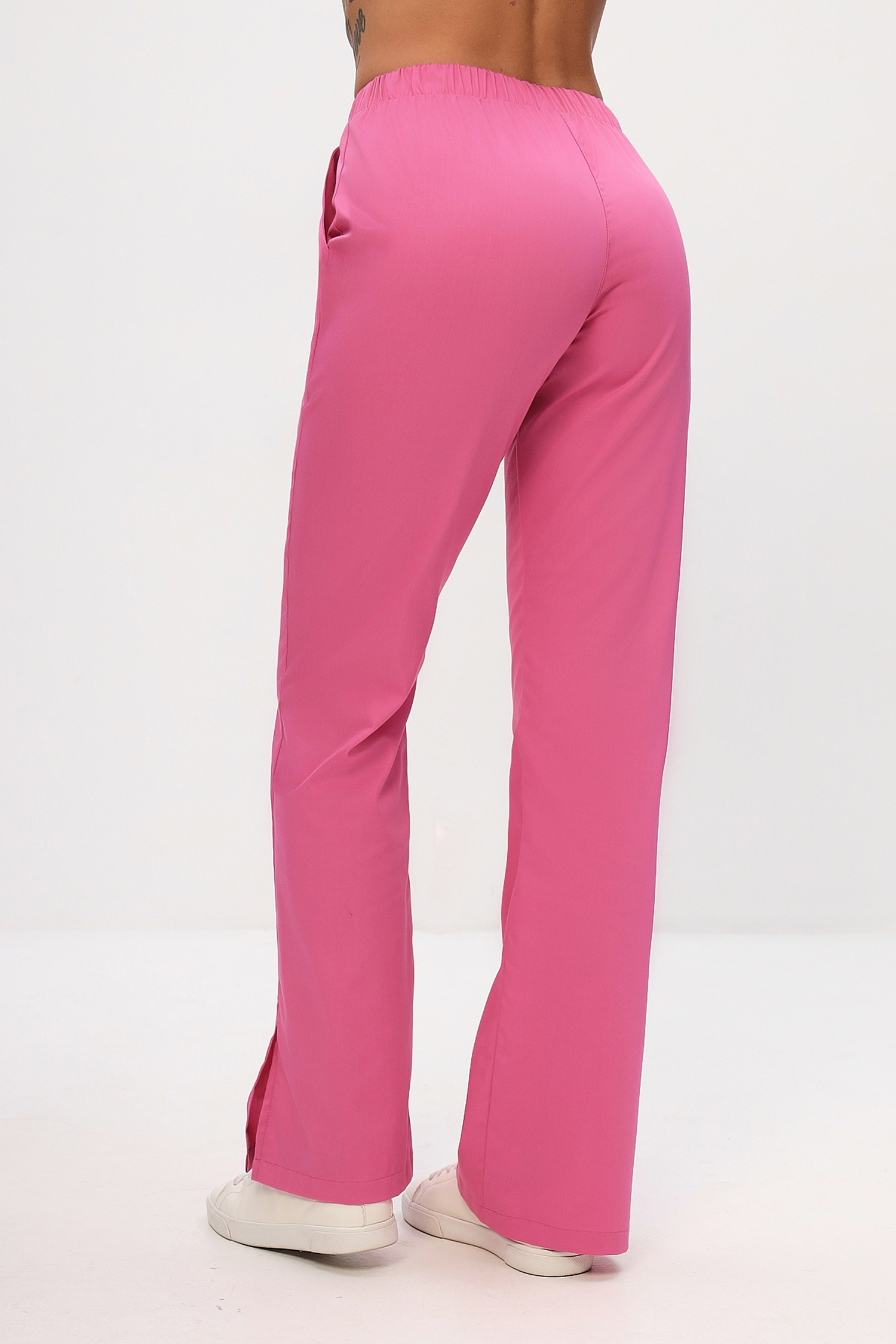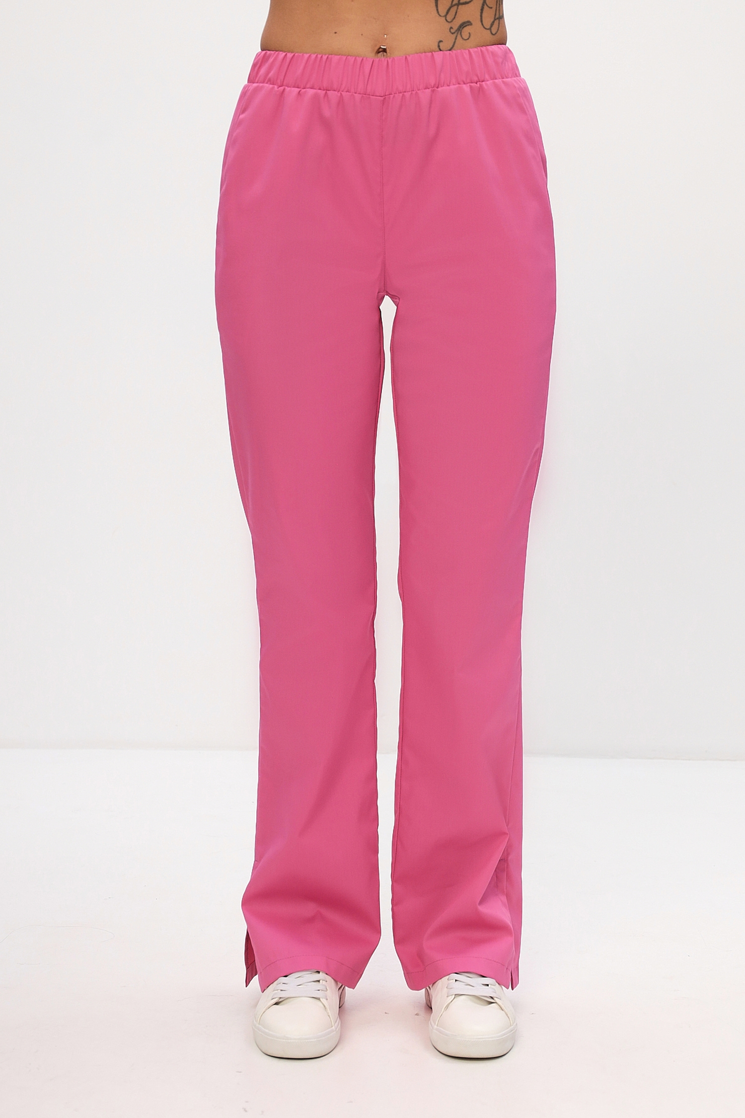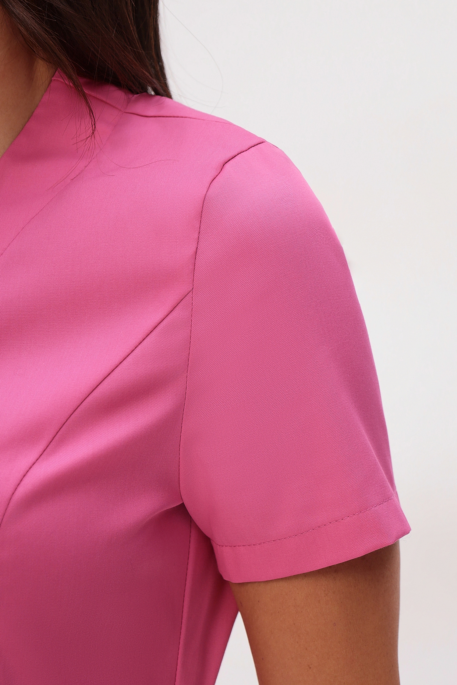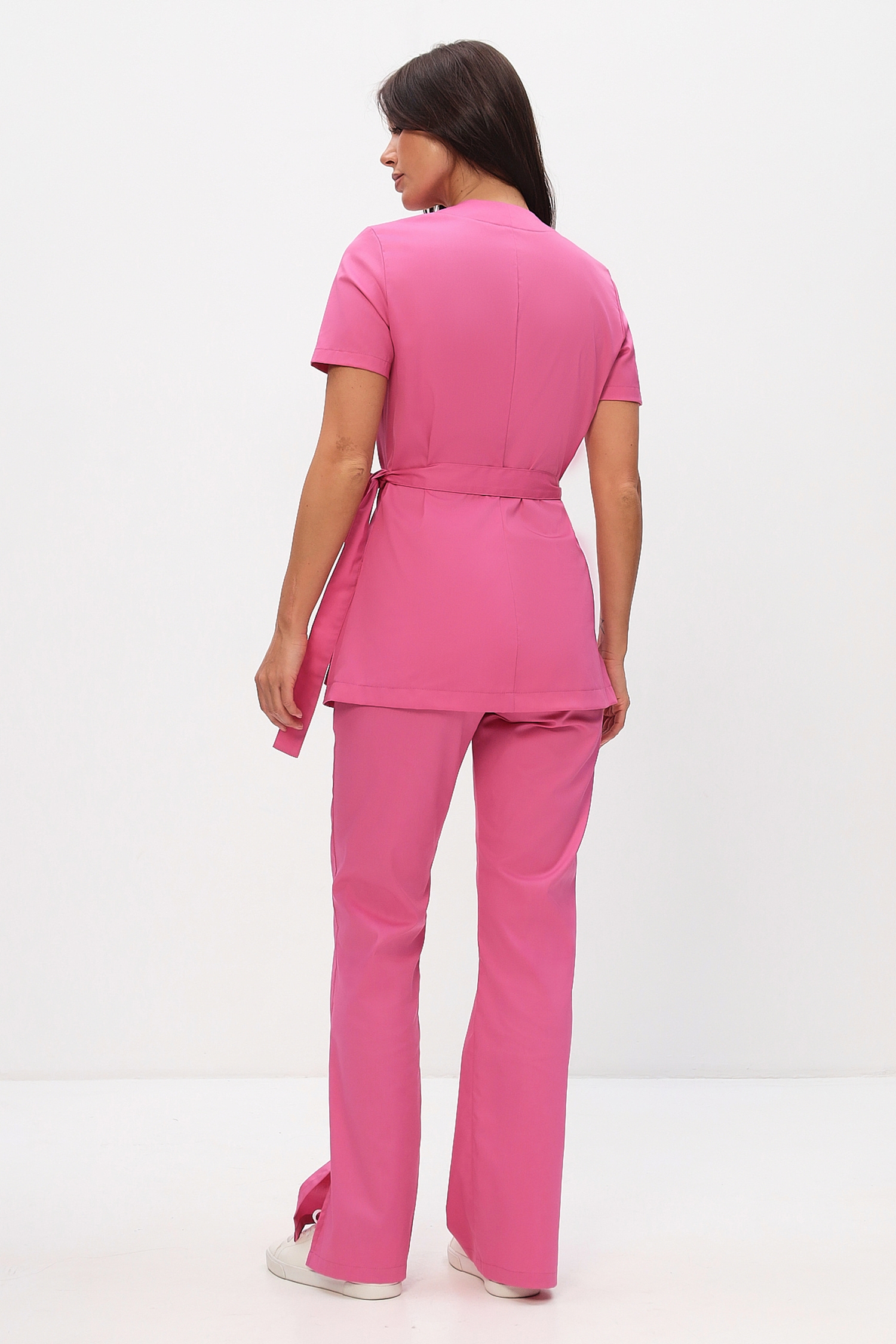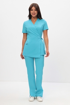 Эффектный и удобный медицинский костюм полуприлегающего силуэта состоит из удлиненной блузы на запах, который надежно фиксируется поясом через отверстие в боковом шве и прямых брюк на резинке с разрезами по низу боковых швов