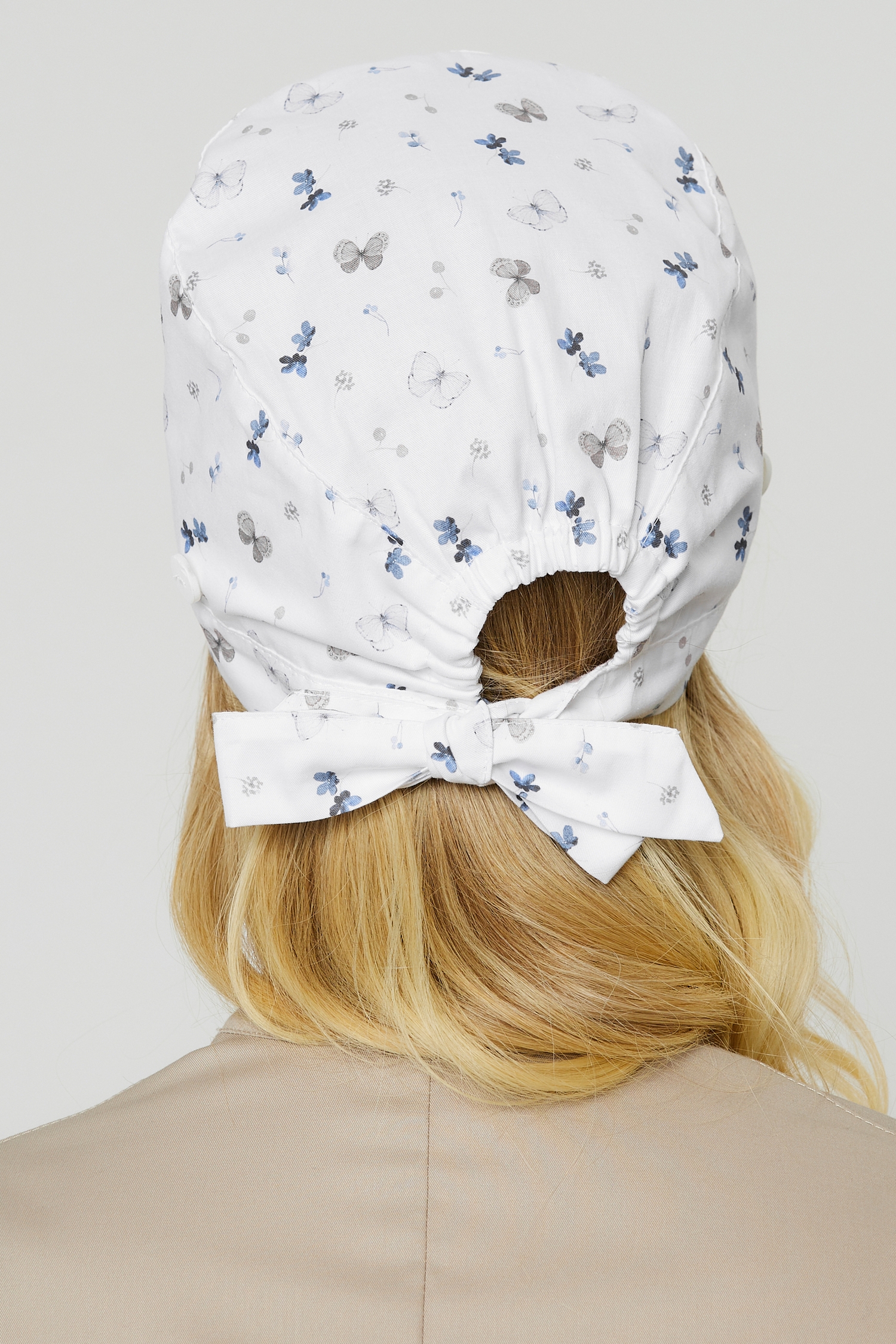 Медицинская шапочка из 100% хлопка с принтом «бабочки». Нежная, приятная ткань. Красивый, ненавязчивый рисунок. Принтованные колпаки универсальные, их можно сочетать с чем угодно, но выигрышнее всего, они будут смотреться с комплектом белого, синего, серого, бежевого цвета.