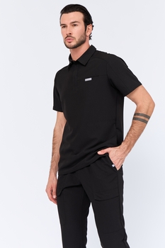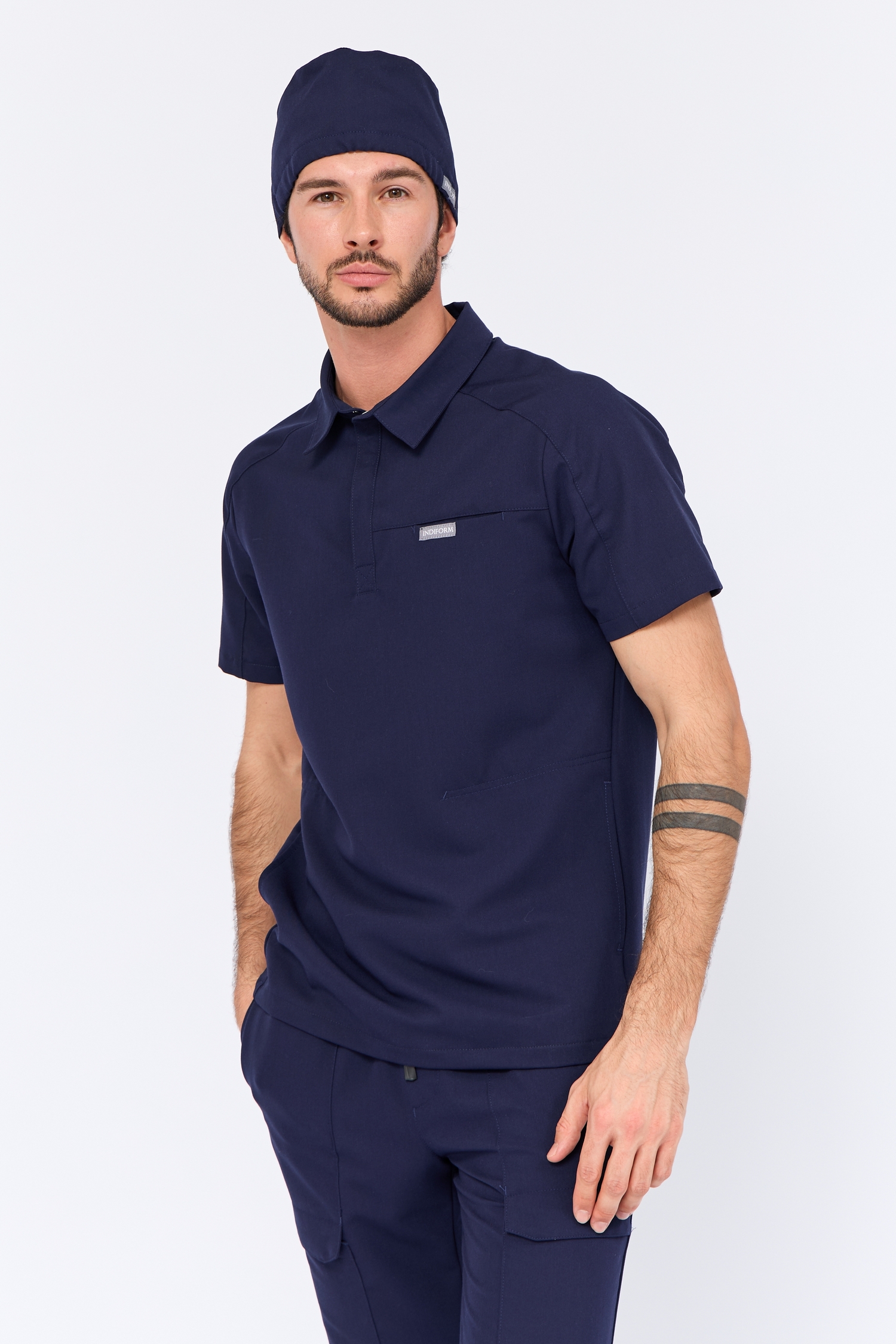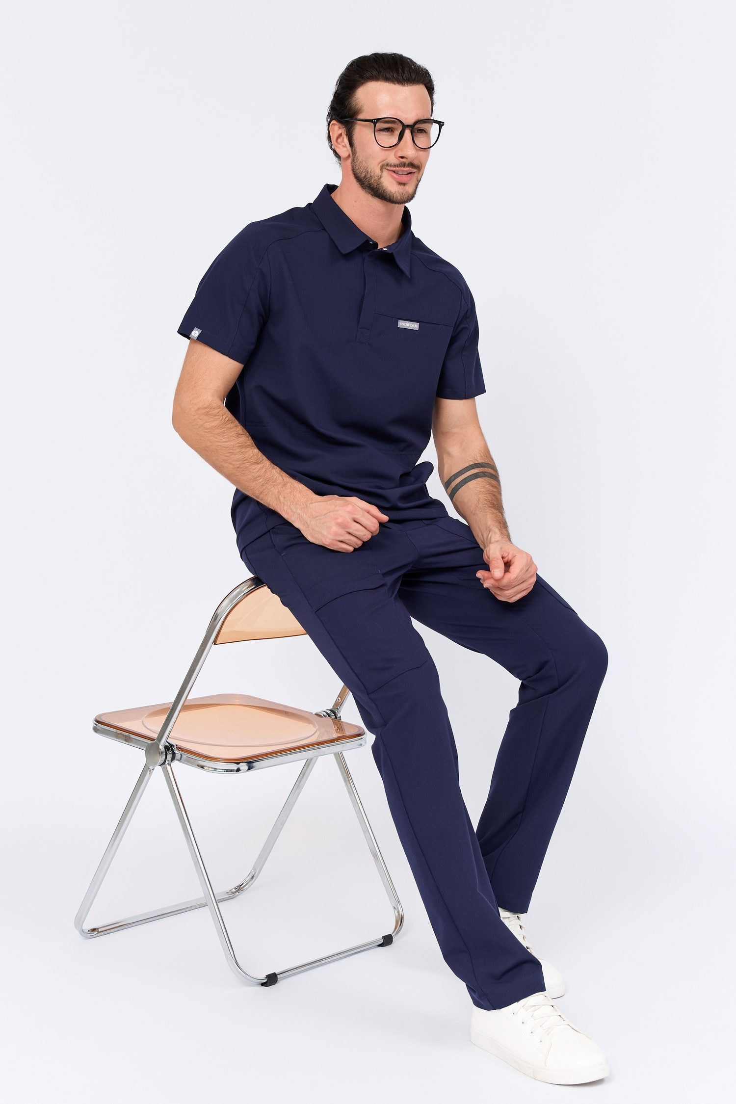 Современная медицинская рубашка-поло прямого силуэта: отложной воротник, планка со скрытими кнопками. Рукав сложной конструкции –цельнокроеный сверху и переходящий в кокетку полочки и спинки, нет жесткого плечевого шва – больше свободы движения.