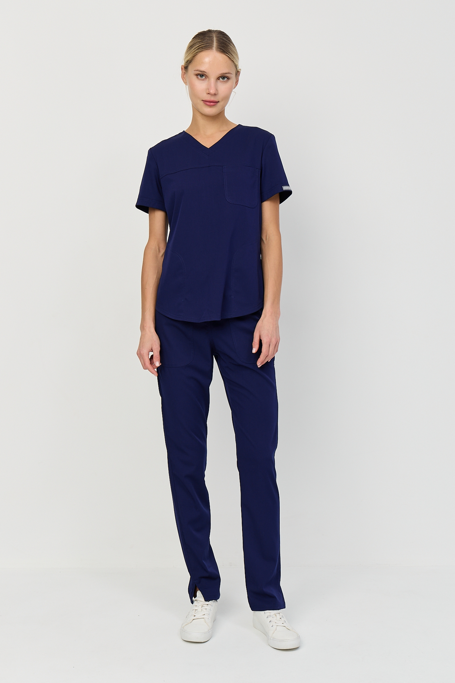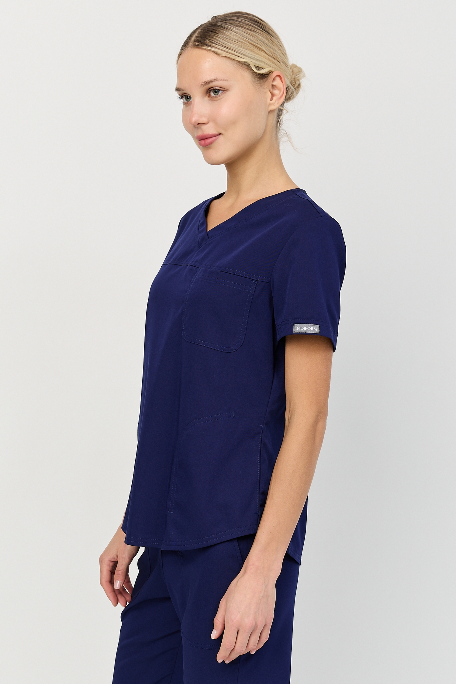 Медицинский полуприлегающий топ с отрезной кокеткой спереди и сзади и фигурной линией низа. Два боковых кармана - расположены в швах и настрочены, есть накладной нагрудный кармашек.