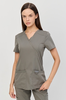 Комфортный медицинский топ полуприлегающего силуэта с имитацией запаха. В боковых швах - разрезы для большего комфорта. Есть два накладных кармана. На левом кармане пришита петля из шляпной резинки, а в правом - шлёвка, разделенная строчкой на две части.